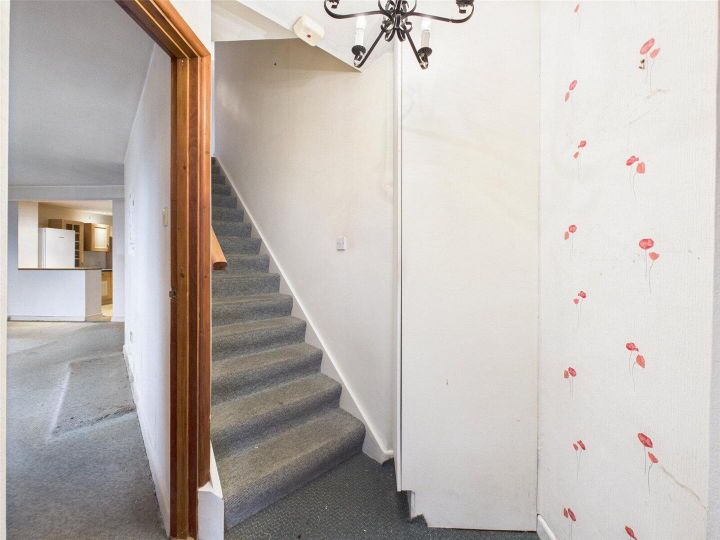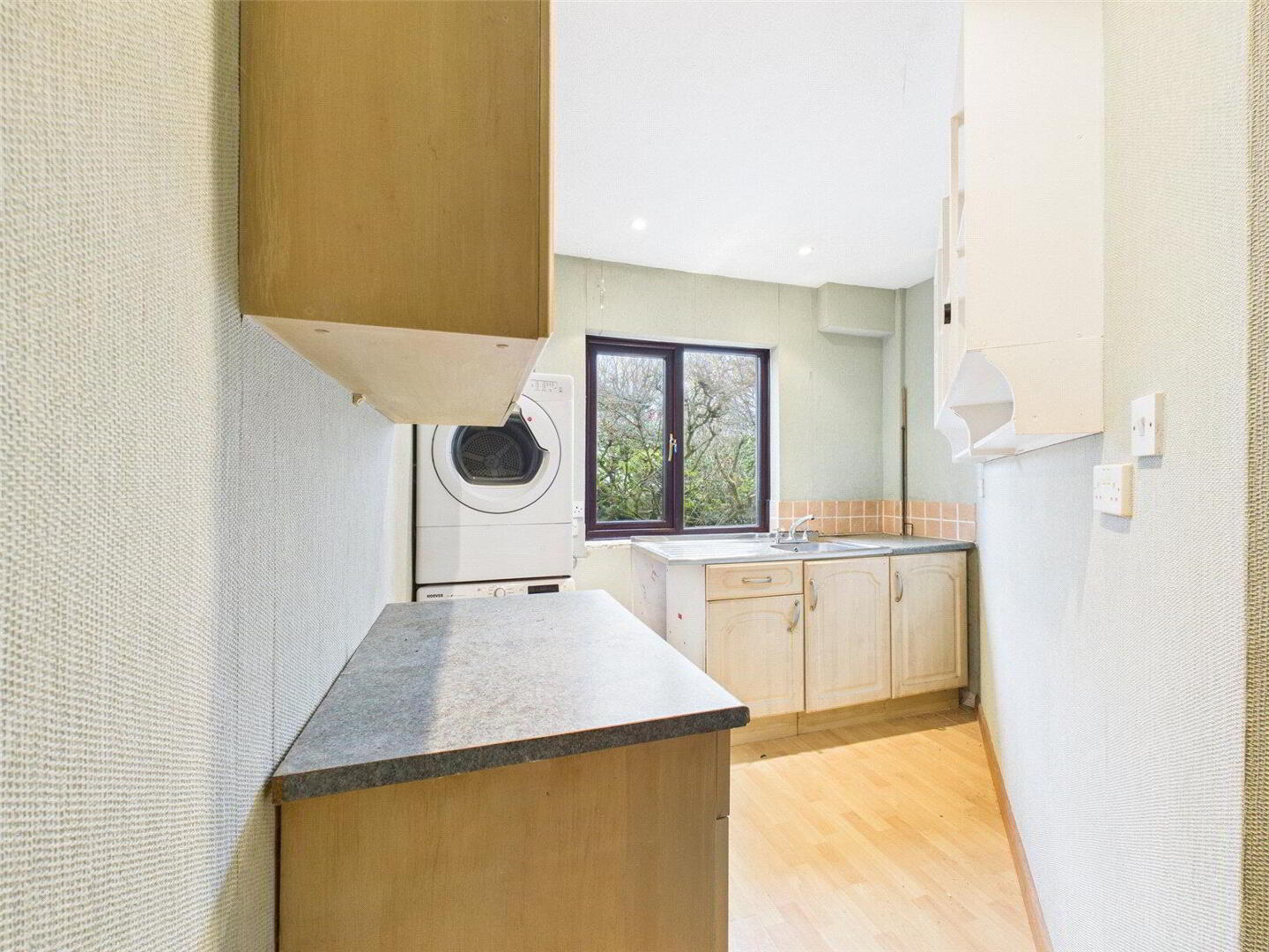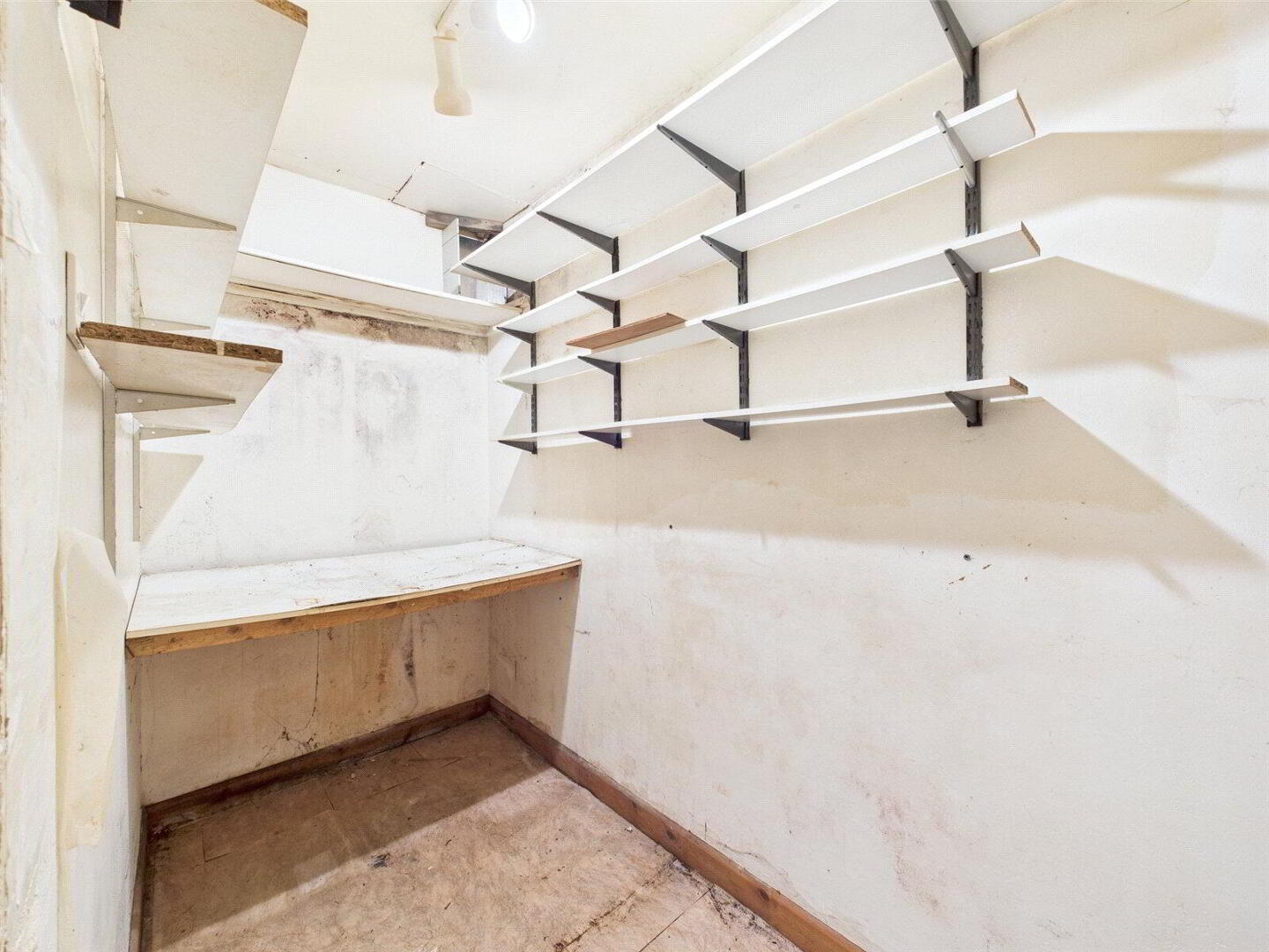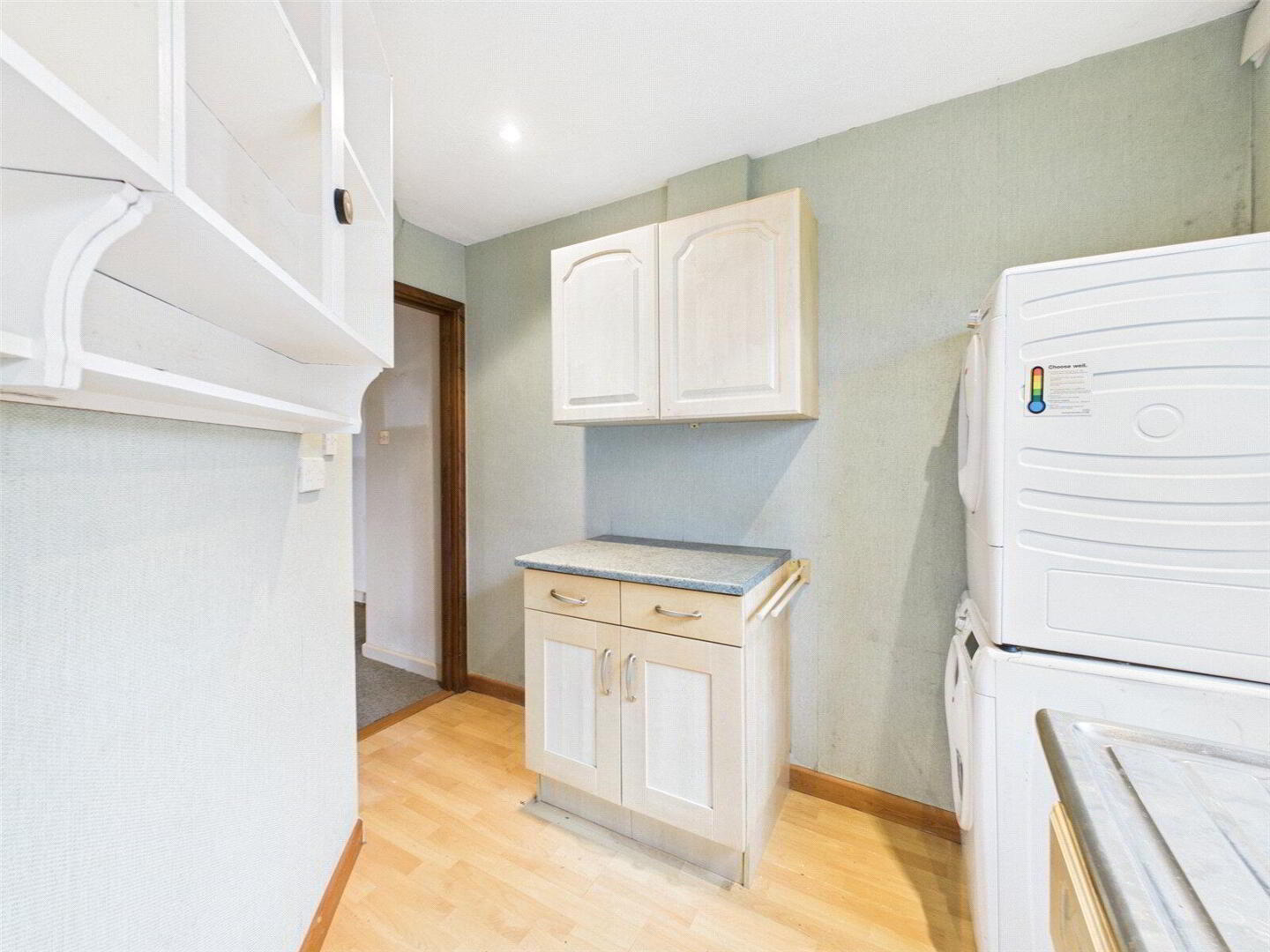 To the right of the living area, a generous utility room fitted with a sink, washer, and dryer adds convenience and practicality. The well-proportioned kitchen includes integrated appliances and ample space for meal preparation, while an adjacent pantry or storage area with surrounding shelving offers excellent organisation potential.