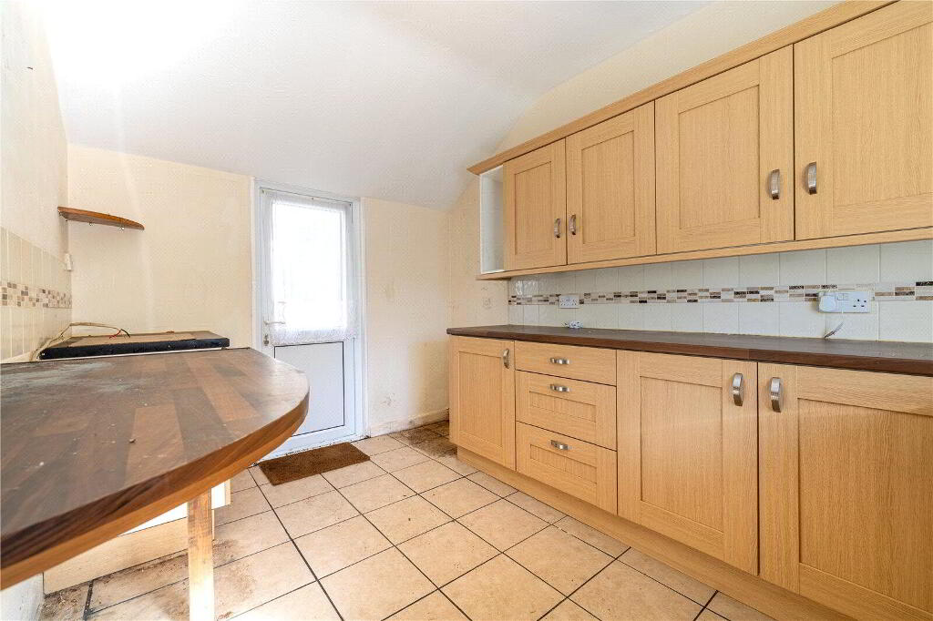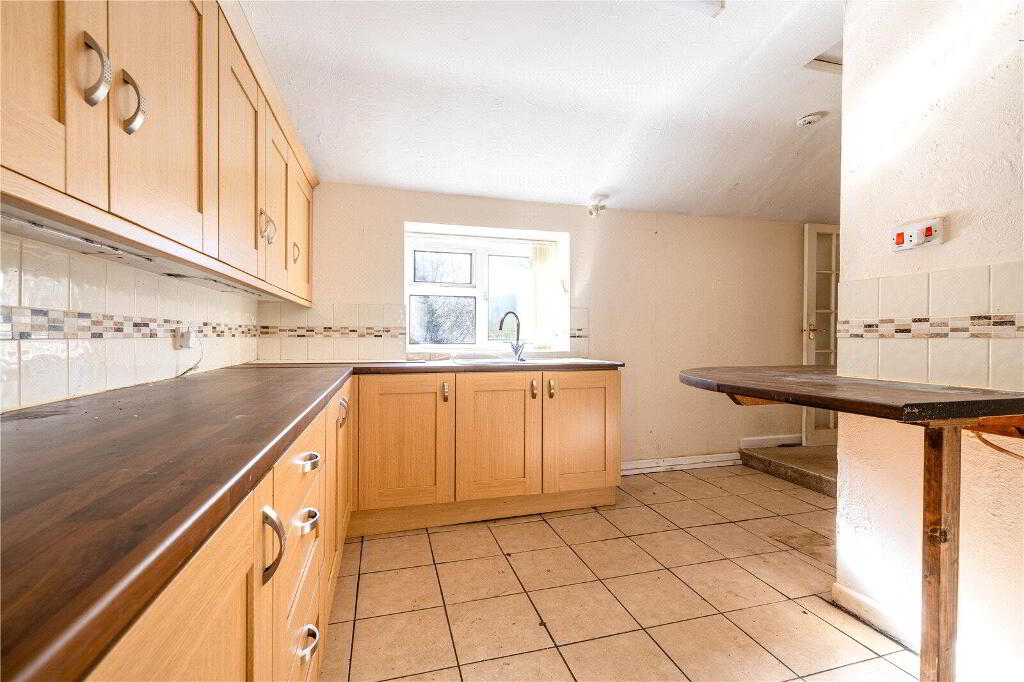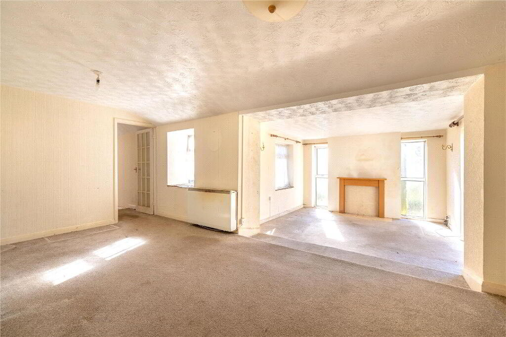 Inside, the expansive L-shaped Lounge / Diner is flooded with natural light from its triple aspect windows, with the potential to add a feature fireplace and having French doors leading to the garden and patio area. The large fitted Kitchen provides ample storage with wall and floor units, a spacious breakfast bar, space for a cooker and under-counter provisions for white goods. A front facing window captures stunning garden and countryside views, while a UPVC double glazed door leads to the rear courtyard.
