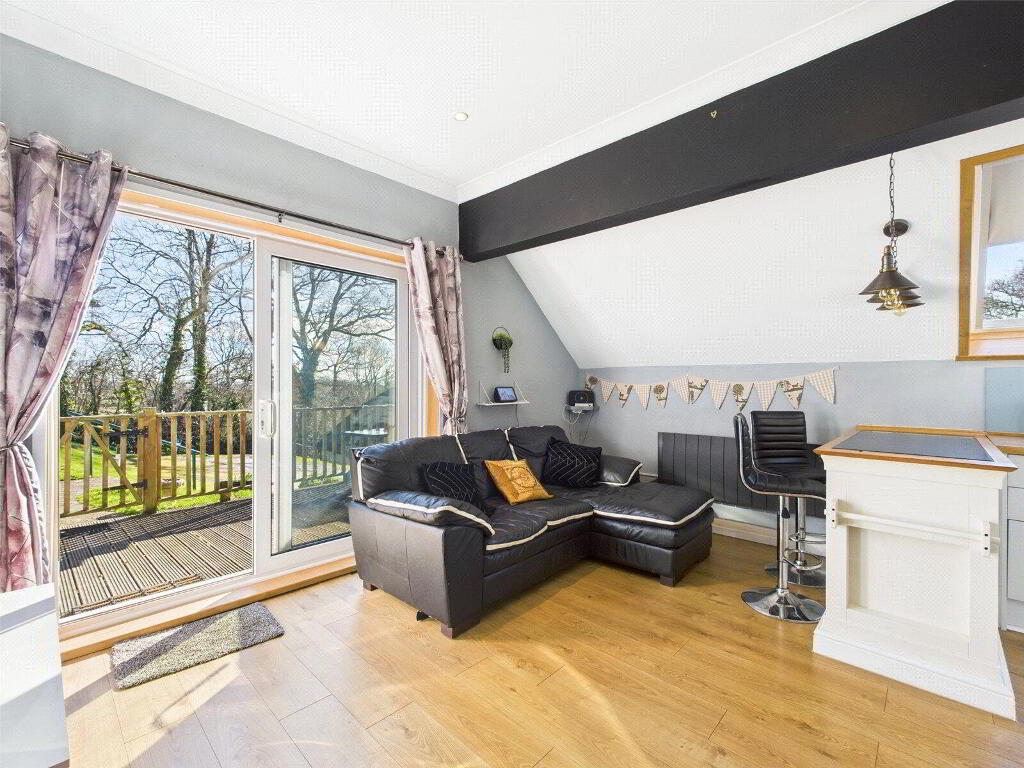 Designed with relaxation in mind, the home features an open-plan living space that seamlessly integrates a well-appointed modern kitchen with spacious dining and lounge areas. Large patio doors serve as both the main entrance and a gateway to the private decked terrace, inviting natural light to flood the interior and enhancing the sense of space.