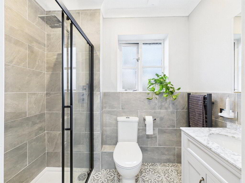 Fitted with a large walk in shower cubicle with mains fed shower over, low flush WC, vanity unit with inset wash hand basin and heated towel rail. Frosted window to rear elevation.