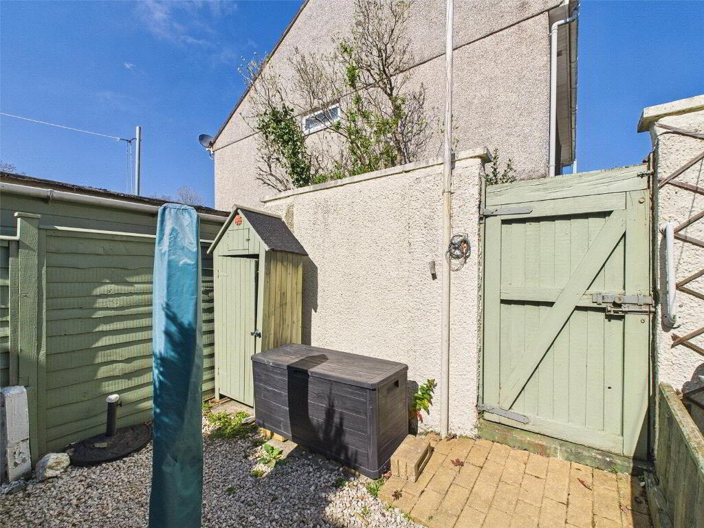 At the rear of the property, a useful rear porch gives additional access to the garden, which has been thoughtfully designed for ease of maintenance. The rear garden is predominantly laid to patio with a gravel area, making it both low-maintenance and ideal for outdoor entertaining, gardening, or simply enjoying the sun. Additionally, there is a wooden shed offering valuable extra storage space. A wooden gate leads to the garage and off-road parking area, providing both convenience and privacy with easy access for your vehicle.