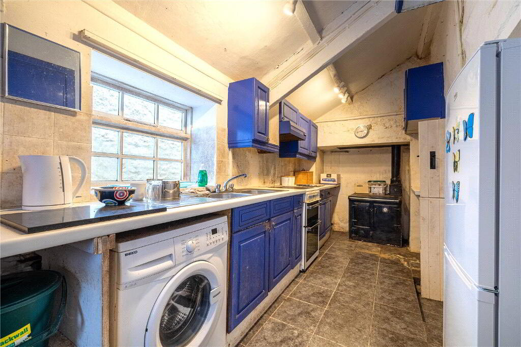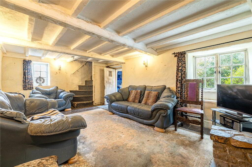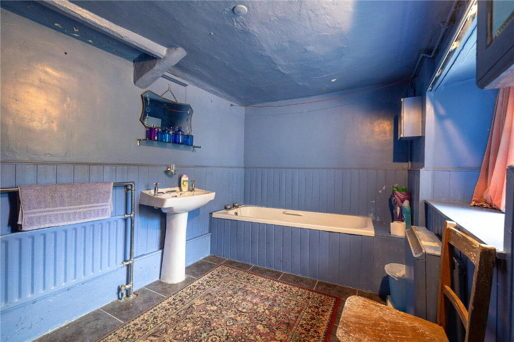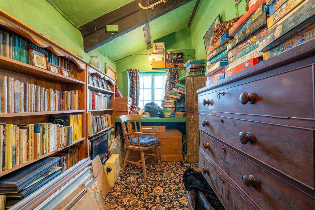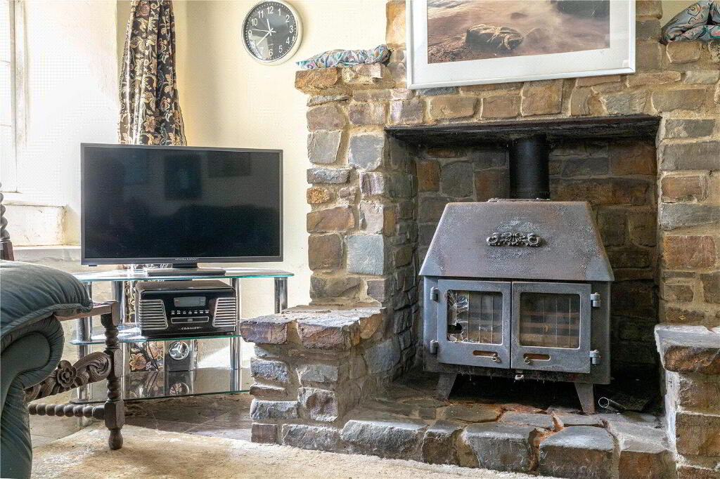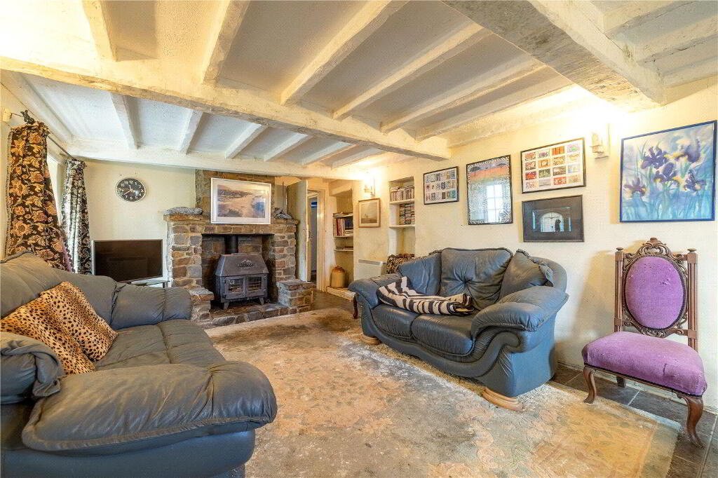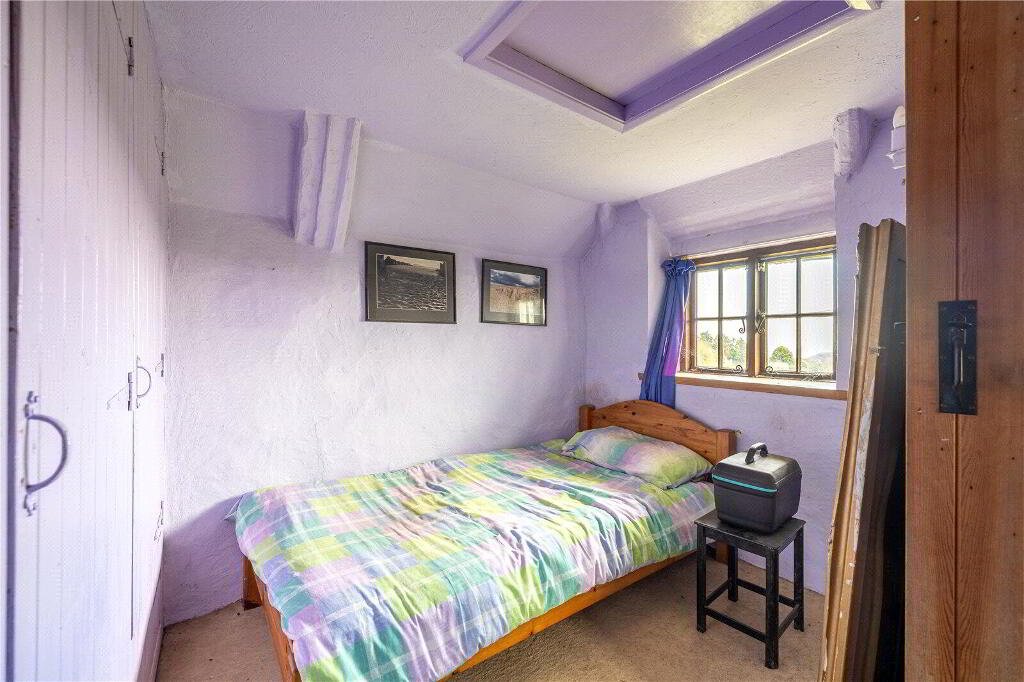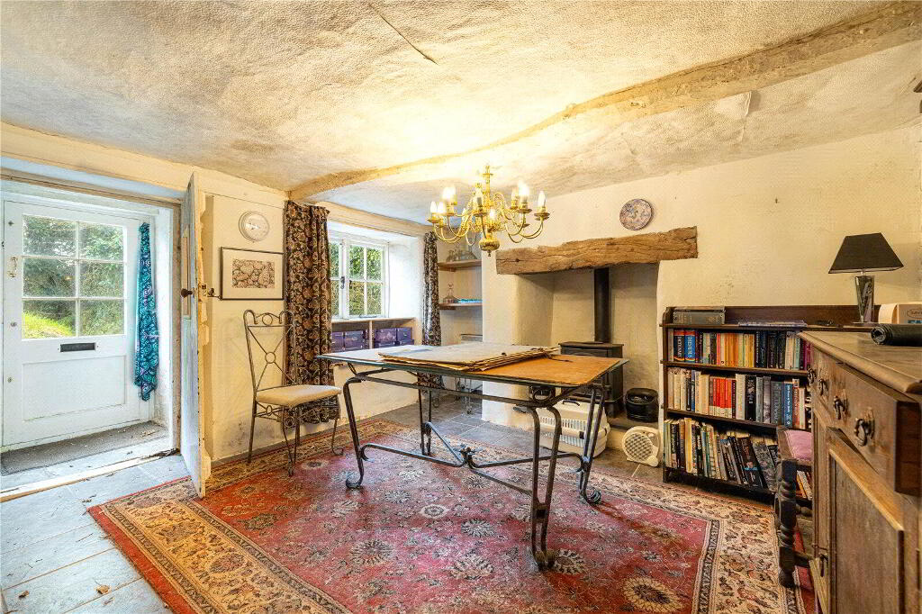 Whilst the cottage would benefit from updating and modernisation, it is brimming with character and immense potential, either as a dream forever home or as an idyllic holiday retreat. Currently, the Ground Floor comprises 3 Reception Rooms and a Kitchen. The spacious Living Room enjoys a welcoming atmosphere with direct access to the Front Porch, garden views, and an attractive fireplace with a wood burning stove. The Dining Room, conveniently situated off the Kitchen, similarly features a charming stone fireplace with a wood burning stove, garden views, and another Porch entrance. The Kitchen includes a range of painted blue cabinetry, ample worksurfaces and space for domestic appliances. Completing the Ground Floor layout is a large Bathroom and an inviting Sitting Room currently utilised as a Reading Room.