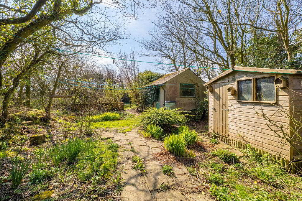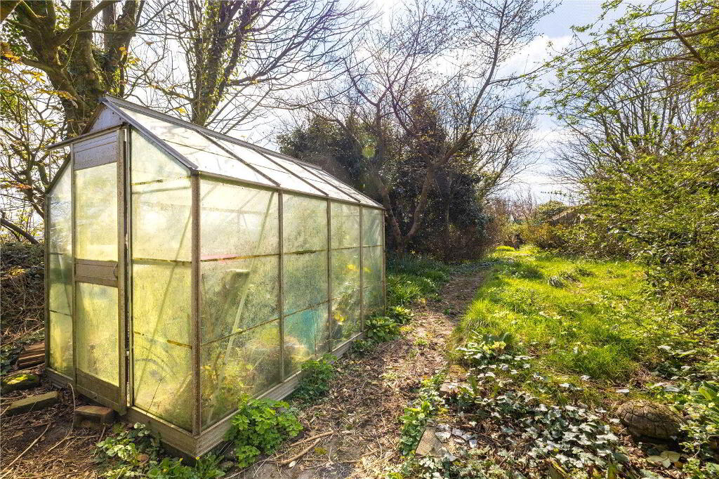 The garden provides practical amenities, including a greenhouse, shed and garage. There is ample off-road parking accessed from the road through double doors.