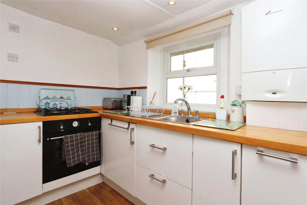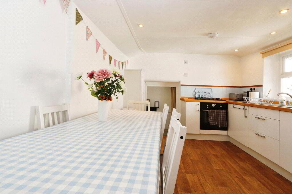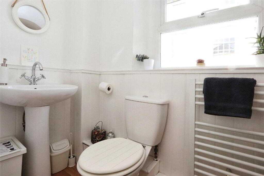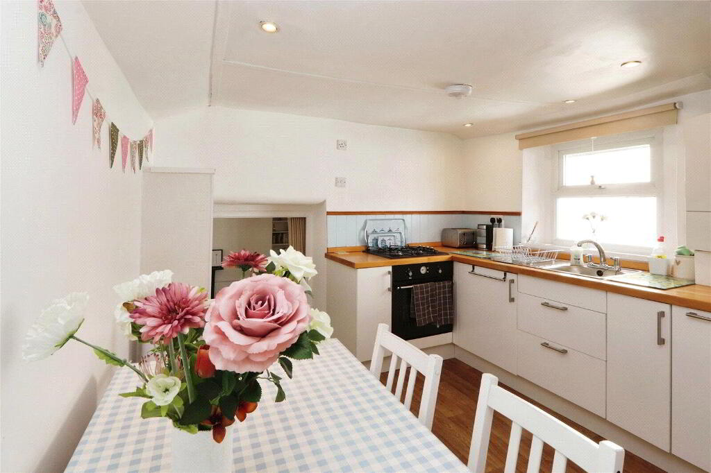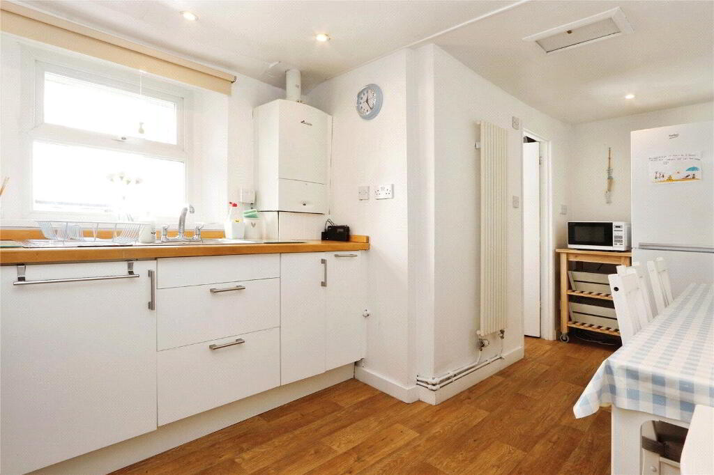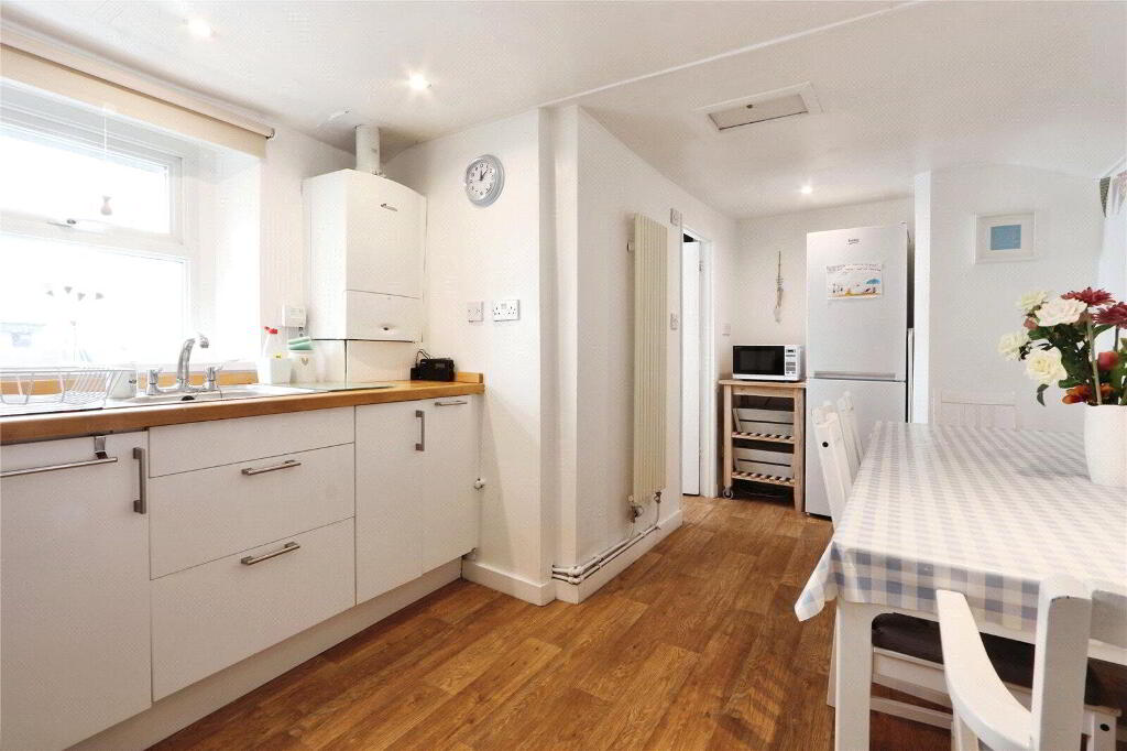 Another lovely, light and airy room with plenty of space for dining table. UPVC double glazed window. Equipped with a range of base level cabinets and drawers, wood block style work surfaces with splashbacking and single bowl sink and drainer with mixer tap over. Built-in 4-ring gas hob and built-in oven. Fridge / freezer included in the sale. Wall mounted gas fired combination boiler. Radiator, down lights, wood effect vinyl flooring. Door to small Pantry. Door to Cloakroom. - Cloakroom