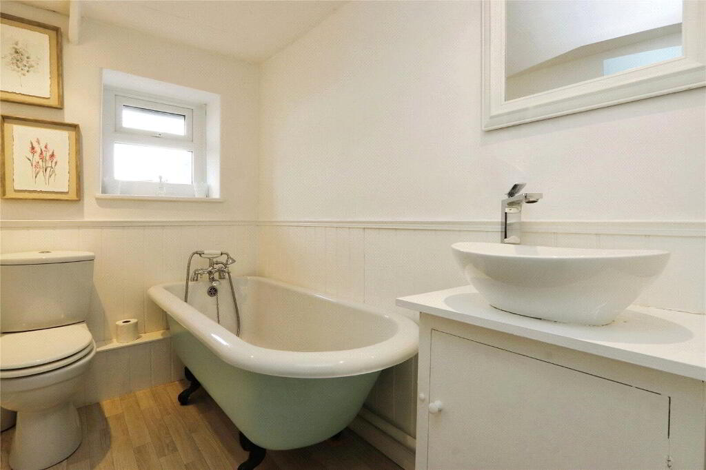 UPVC double glazed window. Close couple dual flush WC, rolltop bath with shower attachment and cabinet mounted circular wash hand basin with mixer tap over. Wood effect vinyl flooring, heated towel rail, down lights, extractor fan. - Agents Note