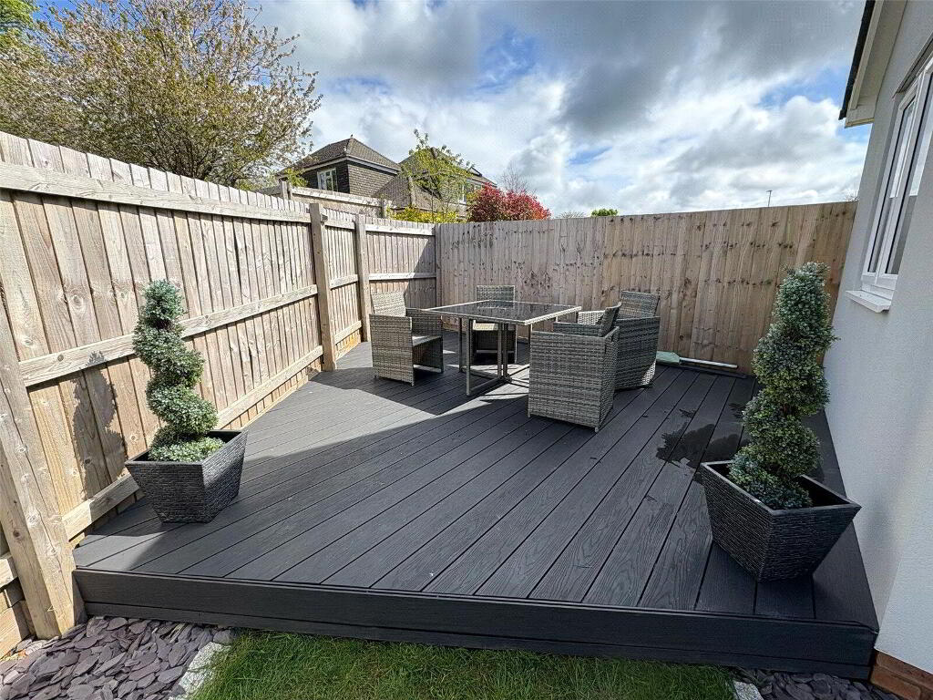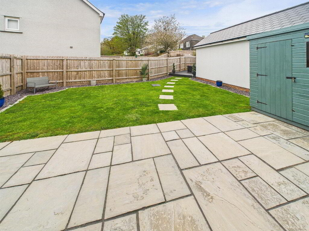 Outside, the garden is a true sanctuary. Featuring stunning Indian sandstone paving, a generous lawn bordered by elegant slate chippings, and a spacious composite decking area, this outdoor space is ideal for relaxation or hosting guests. A garden shed is also included, and off-road parking for two vehicles adds further convenience.