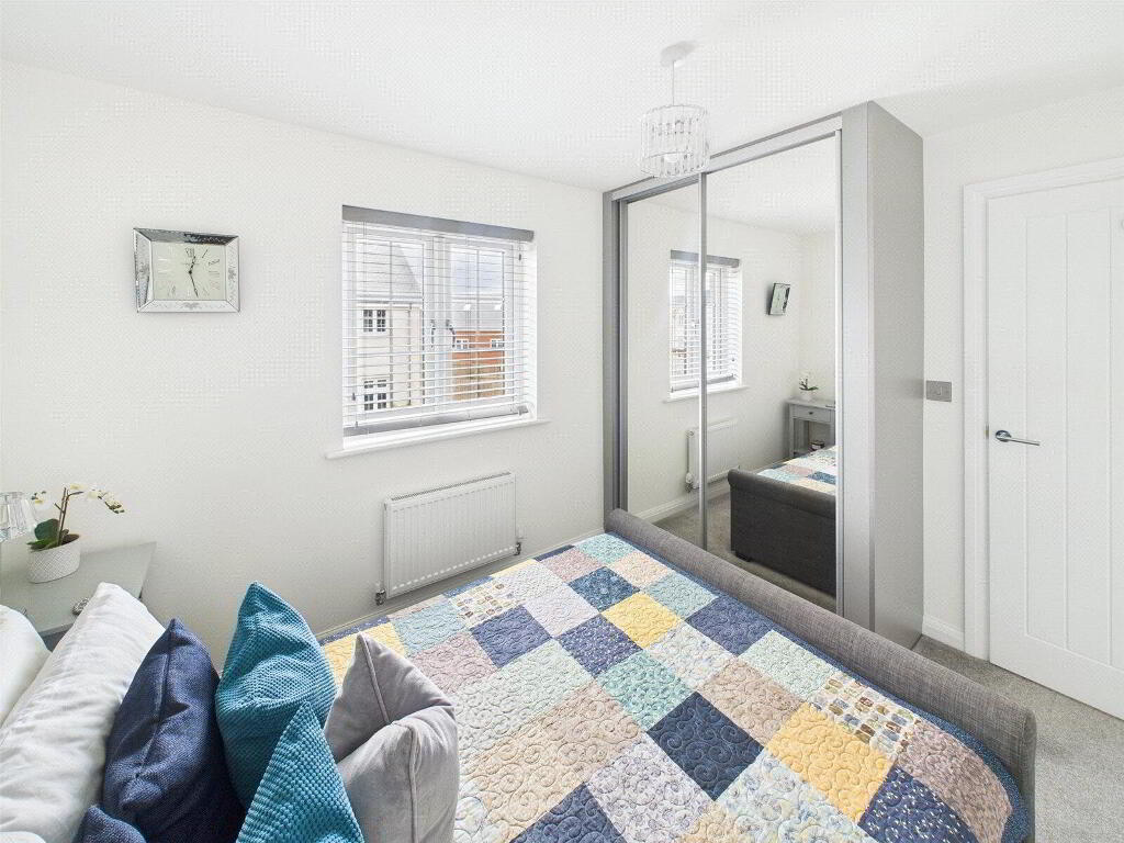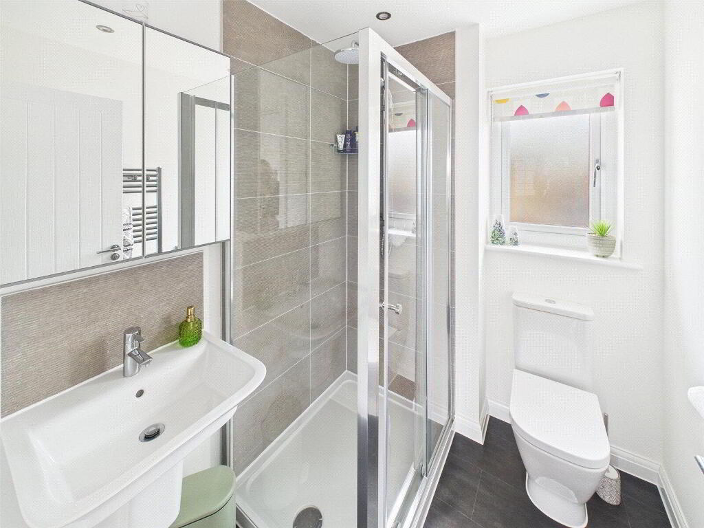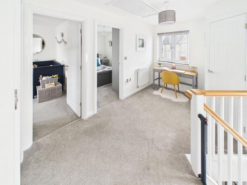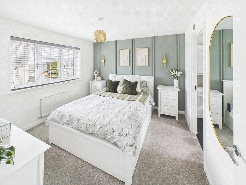 Convenience is key, with a stylish cloakroom and a discreet storage cupboard located on the ground floor. Upstairs, the spacious landing creates an ideal space for a home office or additional seating area. The first floor boasts three generously sized double bedrooms, each finished to the highest standard. The master suite benefits from a luxurious en-suite shower room, while two of the bedrooms feature bespoke built-in mirrored wardrobes, providing both style and functionality. A modern family bathroom, designed with sophistication in mind, completes this level.