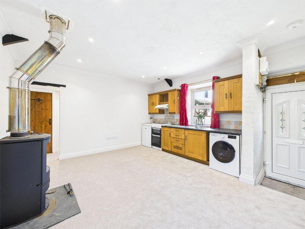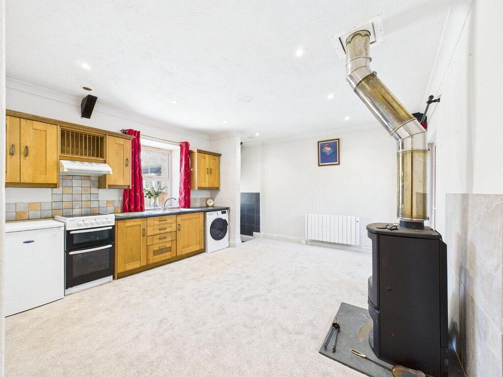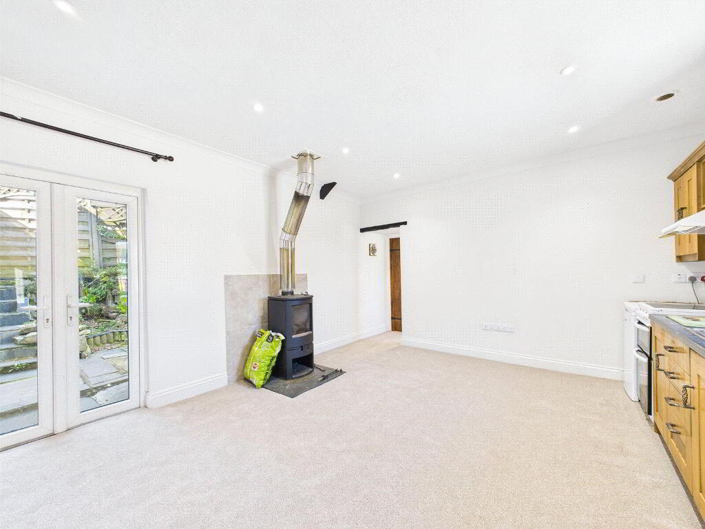 Fitted with a range of matching wooden wall and base mounted units with work surfaces over, incorporating a stainless steel sink drainer unit with mixer tap. Space for electric oven and fridge. Plumbing for washing machine. Ample room for dining table and chairs and sitting room suite. Feature wood burning stove. Double glazed French patio doors leading to the enclosed courtyard garden.
