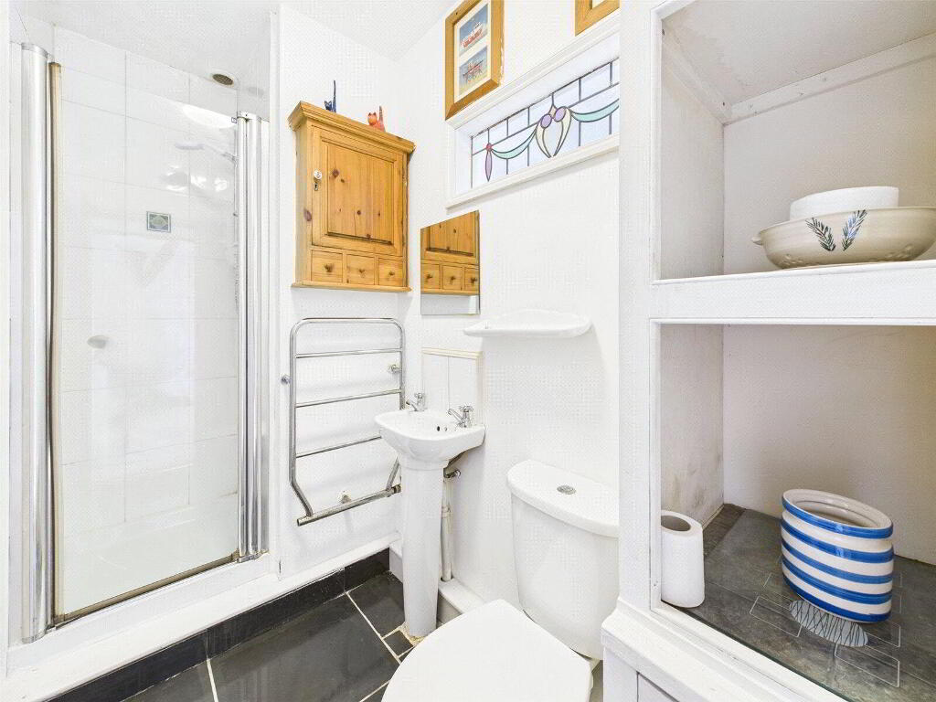 A matching white three piece suite comprising shower cubicle with electric shower over, pedestal wash hand basin and low flush WC. Heated towel rail.