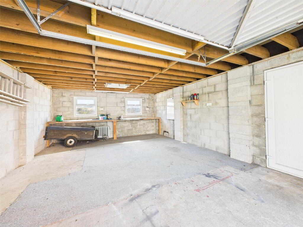 Up and over vehicle entrance door to front elevation and pedestrian door to side elevation. 2 windows to rear elevation. Power and light connected. Large overhead storage in the garage roof accessed by a drop down ladder.