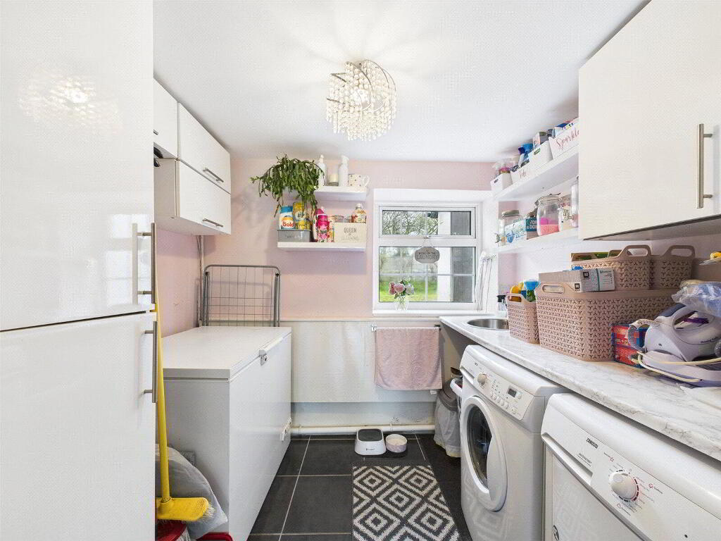 Fitted with a range of storage cupboards. Space and plumbing for washing machine and tumble dryer with worksurfaces over incorporating a circular stainless steel sink with mixer taps. Space for additional chest freezer. Window to side elevation.