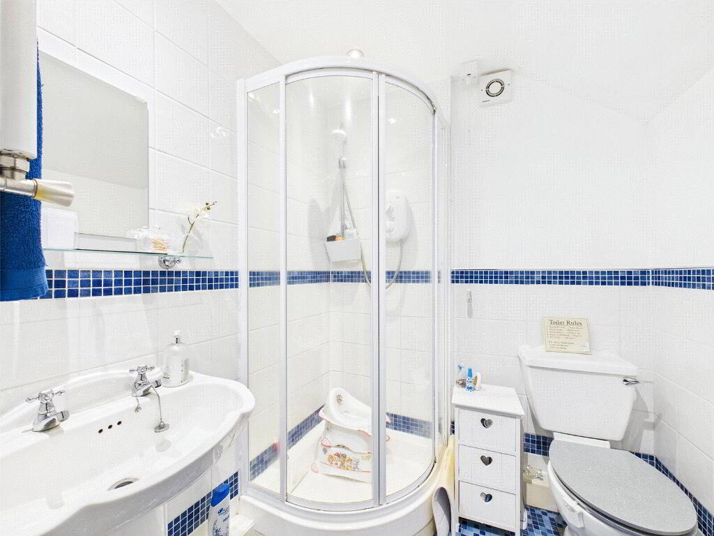 A fitted suite comprising shower cubicle with "Mira" electric shower over, pedestal wash hand basin, close coupled WC and heated towel rail.