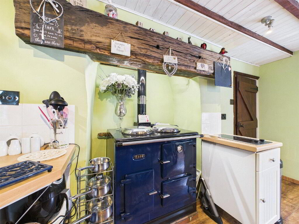 A fitted kitchen comprising wall and base mounted units with work surfaces over, incorporating a ceramic 1 1/2 sink drainer unit with mixer tap. Feature fireplace housing Oil fired Rayburn. Space for free standing fridge/freezer. Ample room for large dining room table and chairs. Bay window to front elevation.