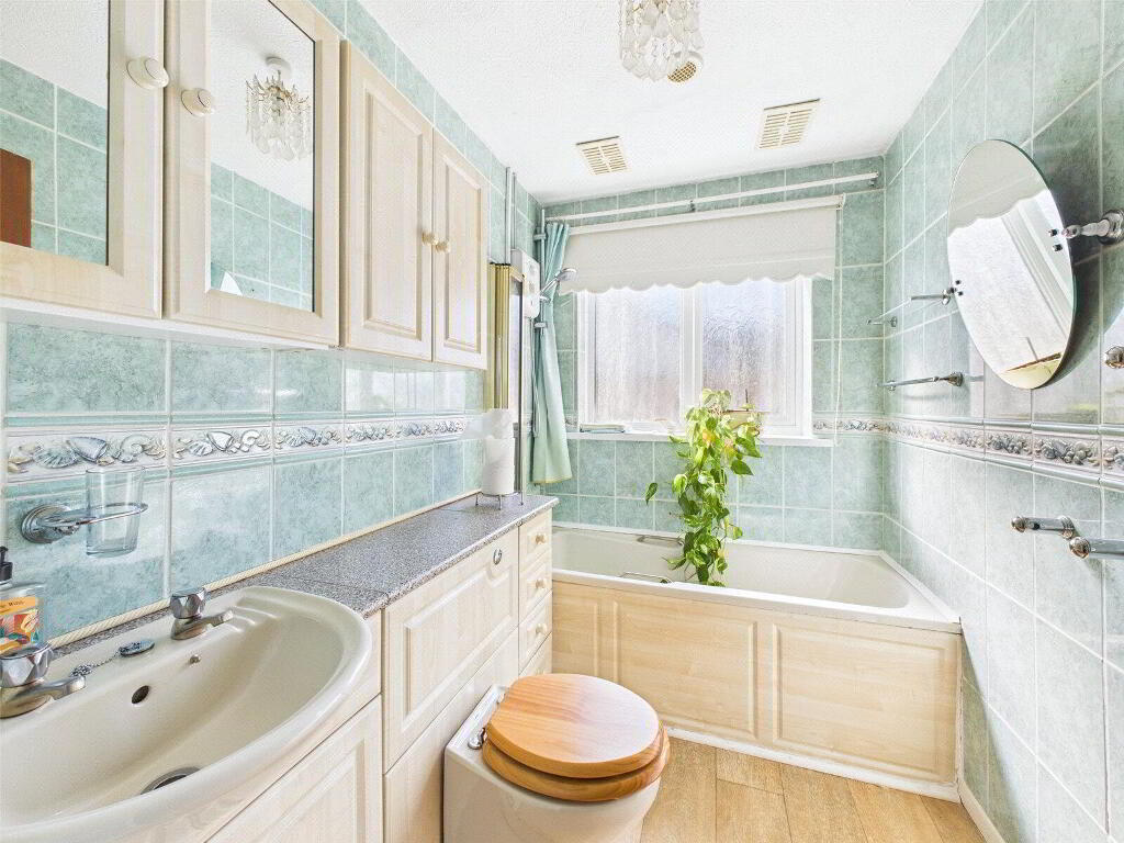 A fitted suite comprises an enclosed panelled bath with an electric power shower over. A vanity unit houses a concealed cistern WC and an inset wash hand basin. Window to side elevation. - Outside