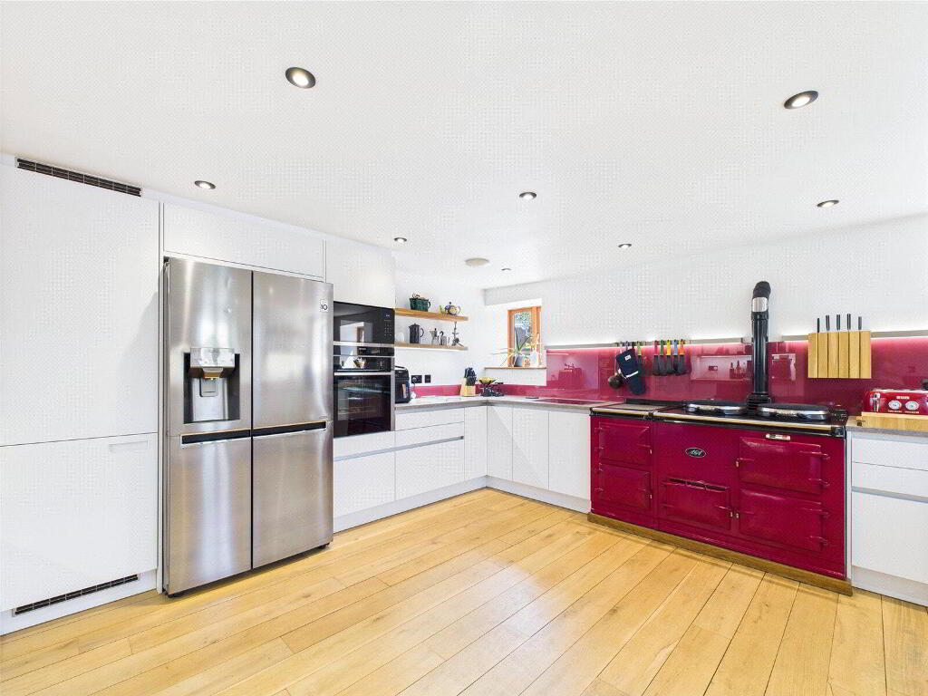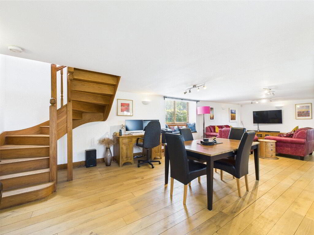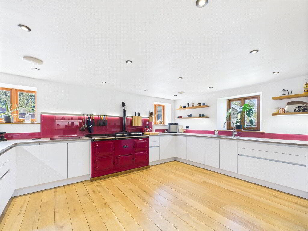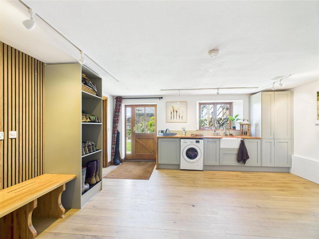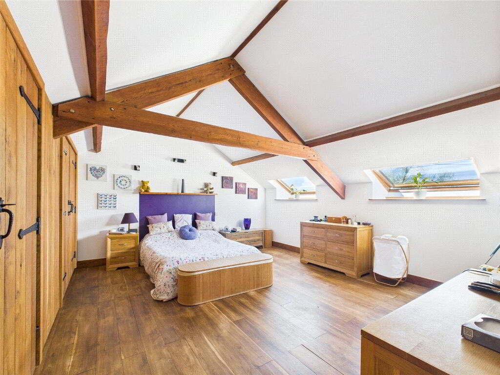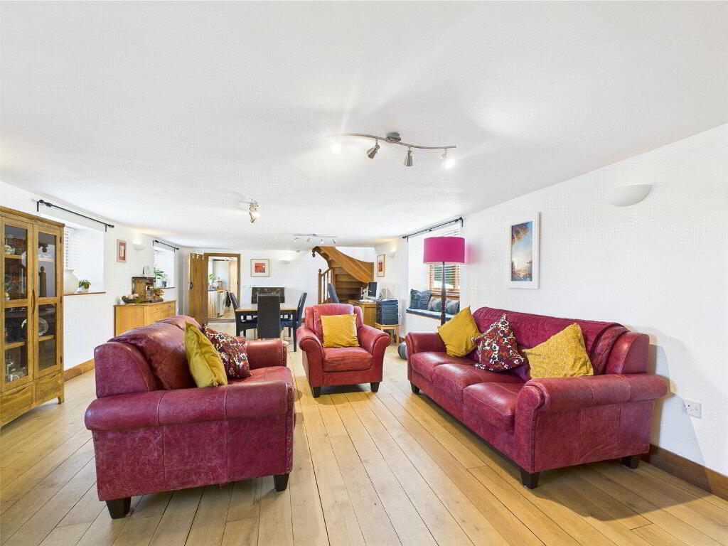 The barn has been sympathetically converted to retain its original character, offering spacious and versatile two-storey accommodation. A welcoming entrance opens into a stunning central reception room—an impressive open-plan space with soaring ceilings, exposed beams, and ample natural light, creating a warm and inviting hub of the home. This expansive area is perfect for both entertaining and everyday living. The ground floor further comprises a well-appointed kitchen, dining area, and additional reception spaces, all thoughtfully laid out to provide flexibility and comfort.