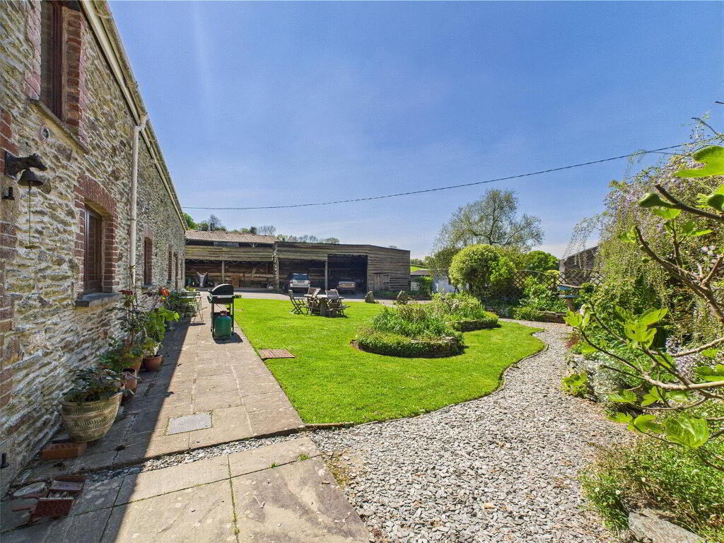 Set in a peaceful hamlet just a couple of miles from Bere Alston, this beautifully converted detached barn offers spacious two-storey living with character features throughout, including a large central reception room and a wide galleried landing. Ideal for equestrian or countryside living, the property sits on approximately 5.53 acres with two enclosed fields, a pond, a stable block with four bays, and a large detached Pole Barn. The well-maintained formal gardens include seating areas, a vegetable plot, and an enclosed orchard, with direct access to a green lane owned by the property—perfect for riding or walking in the surrounding countryside. No Onward Chain