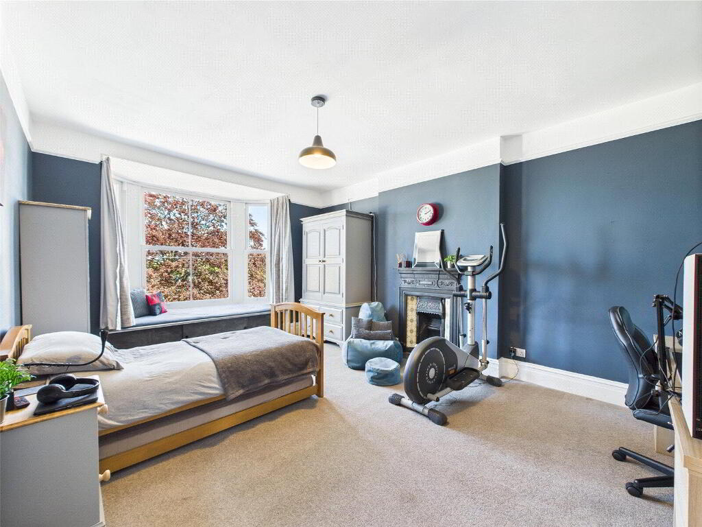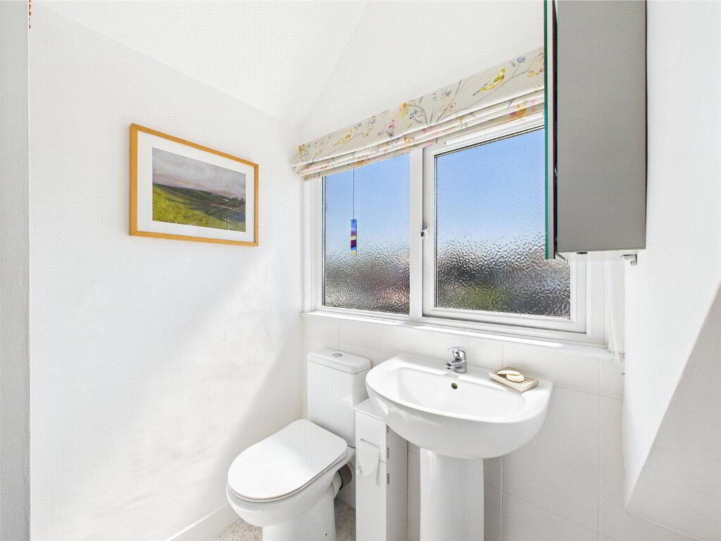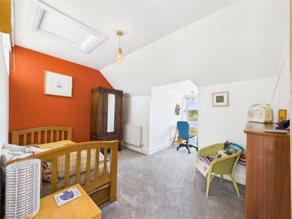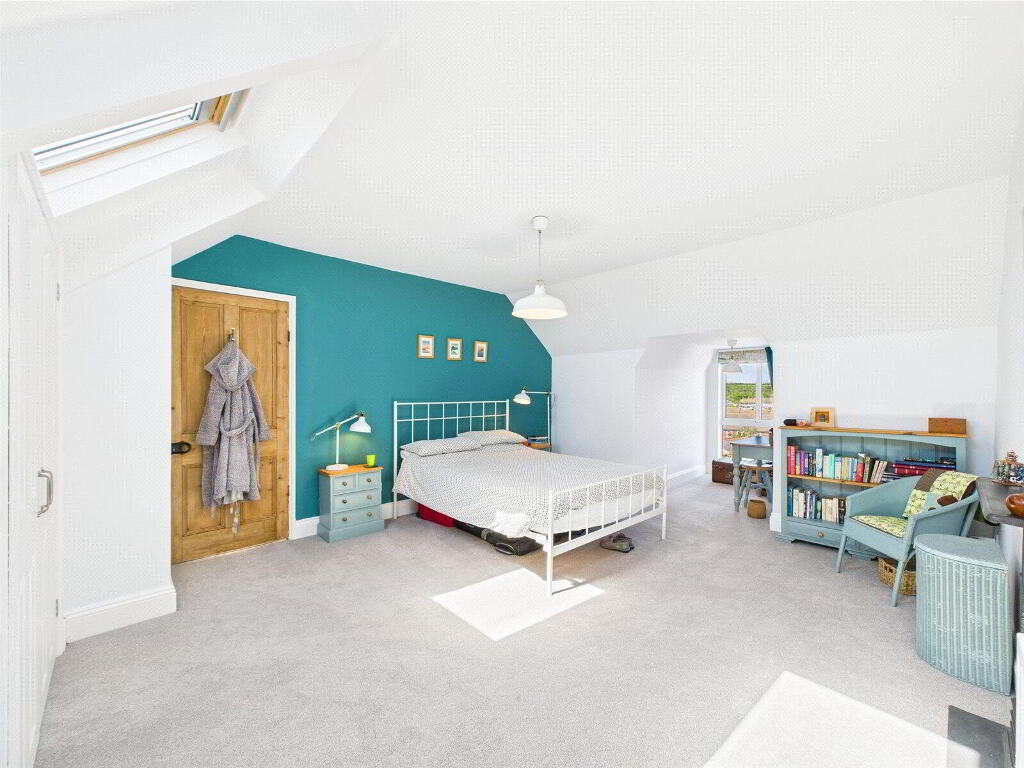 On the top floor, two further double bedrooms await. The master suite is particularly impressive, enjoying dormer windows with elevated views across the town, as well as deep built-in storage. The fifth bedroom, currently used as a guest room, includes loft access via a hatch, with the loft stretching the width of the house and fitted with a light—offering practical storage space. A further modern shower room with W.C. and basin serves this floor.
