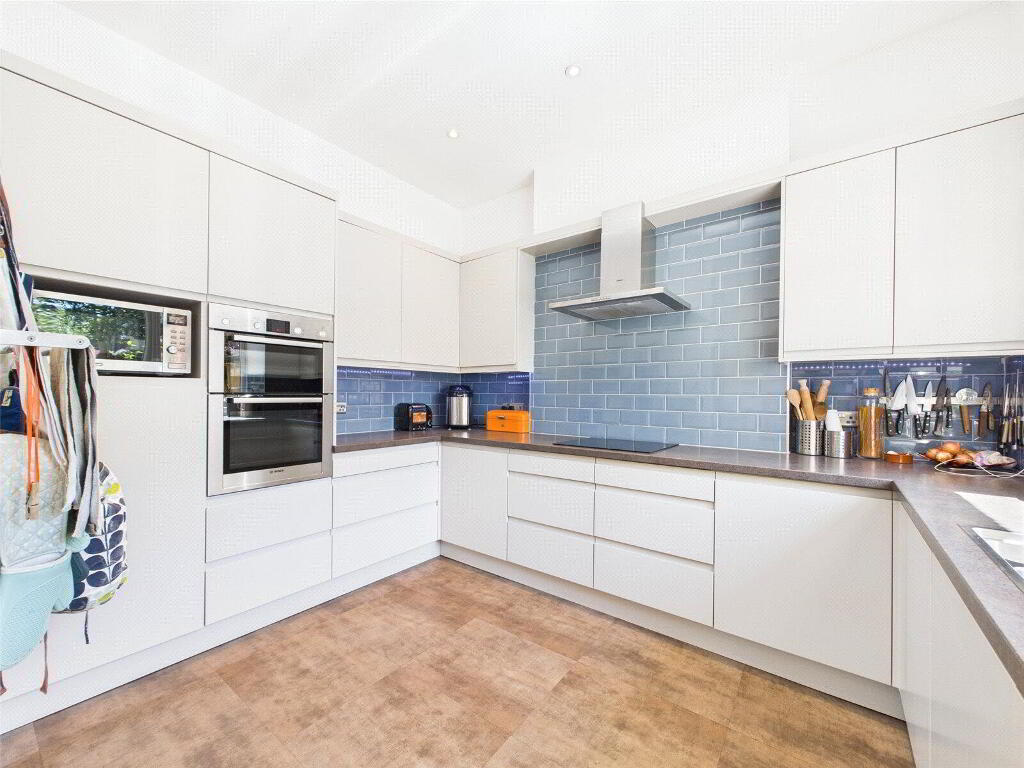 At the rear of the property lies the expansive open-plan kitchen and dining room—once the original dairy kitchen, now thoughtfully opened up to create a sociable and functional heart to the home. The modern kitchen is a cook’s dream, offering built-in appliances, generous worktop space, and LED downlighting, all overlooking the mature rear garden. There is ample room for a large dining table, ideal for entertaining, and a wide doorway provides easy access to the garden, encouraging outdoor dining during warmer months. The room also features a third fireplace housing another wood-burning stove, blending charm and practicality. A dedicated utility room lies off the kitchen, housing the gas boiler, space for white goods, and additional storage.