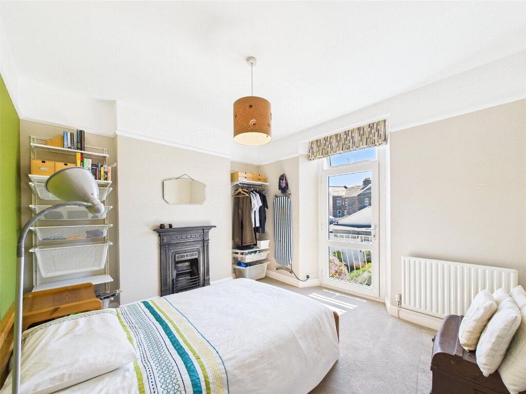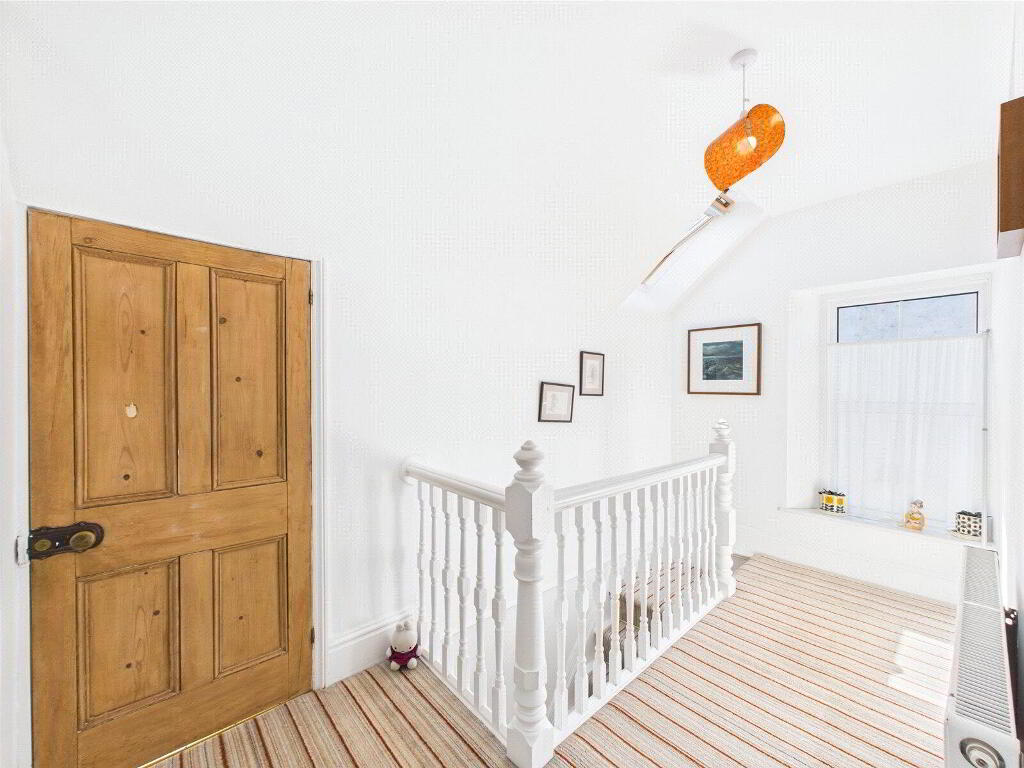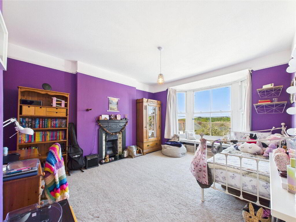 Upstairs, the first floor unfolds from a beautifully lit landing featuring a striking stained-glass window, with three spacious double bedrooms, all complete with original fireplaces. Two front-facing rooms feature deep bay windows with fitted seating, offering far-reaching views across Wadebridge and glimpses of the Camel Estuary. A rear bedroom enjoys garden views and boasts a Juliet balcony—an elegant touch that adds a sense of light and openness. A stylish family bathroom completes this floor, with a bath, separate shower, W.C., and basin.