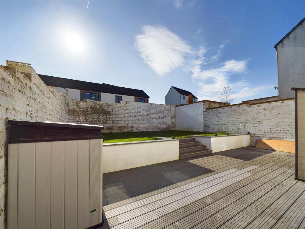 Outside, the rear garden is perfect for enjoying outdoor living. Accessible through both sets of patio doors, the garden features a decked area, ideal for entertaining friends and family, and steps leading up to an elevated lawn, providing both a sense of space and privacy. The garden’s layout is ideal for those who enjoy a low-maintenance outdoor area that can still be enjoyed year-round.