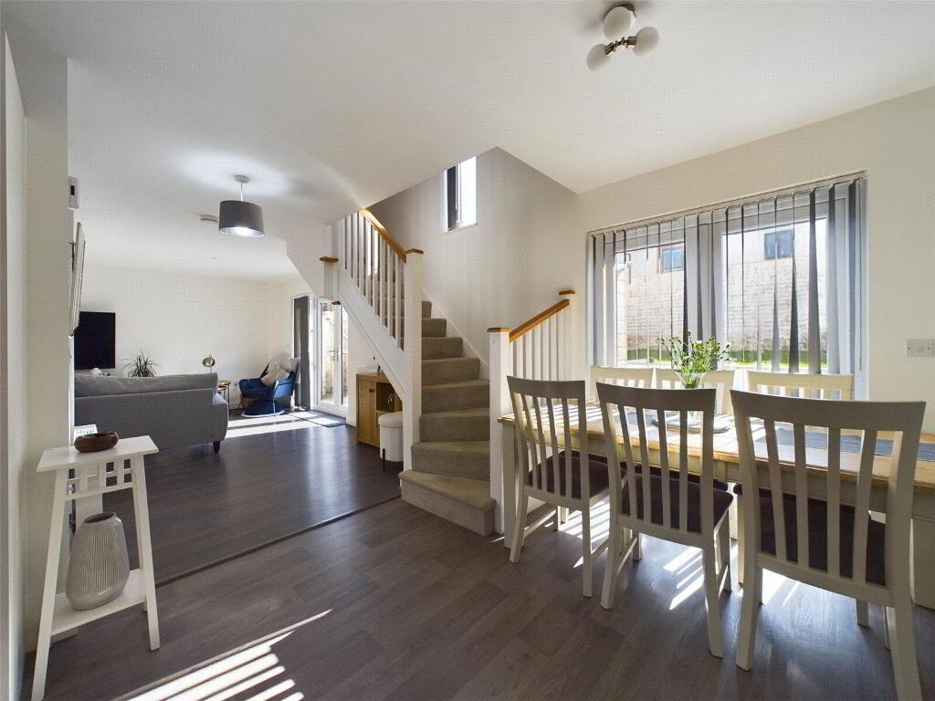 The ground floor offers an impressive open-plan layout, providing flexibility for modern living. To the right is a well-designed kitchen and dining area, featuring plenty of countertop space and modern appliances, making it the perfect space for cooking and dining with family or friends. To the left, the living area offers a bright, inviting space with room for relaxation. Both the kitchen and living room feature patio doors that open directly onto the rear garden, creating a seamless flow between indoor and outdoor living and filling the ground floor with natural light.