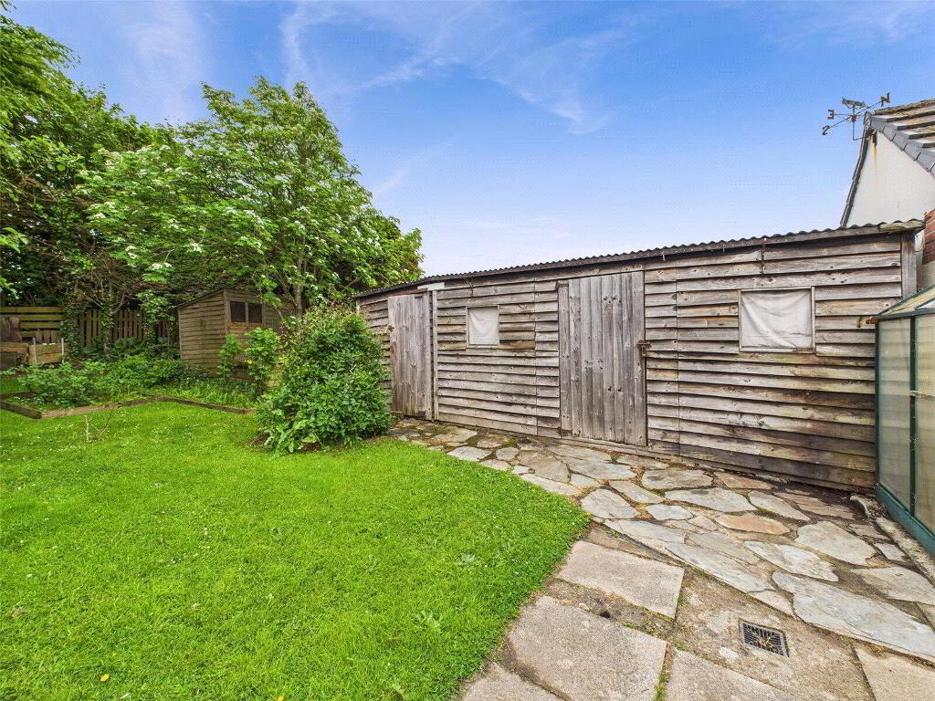At the front of the property, a tarmac driveway offers off-road parking for multiple vehicles and provides access to two single garages. The rear garden is mainly laid to lawn, bordered by mature hedges for added privacy. A patio area provides an ideal space for outdoor dining and relaxation, while a greenhouse and timber sheds offer ample storage and gardening opportunities. Garage 1 is also accessible via a pedestrian door.