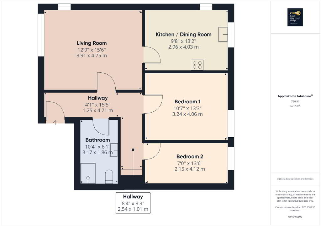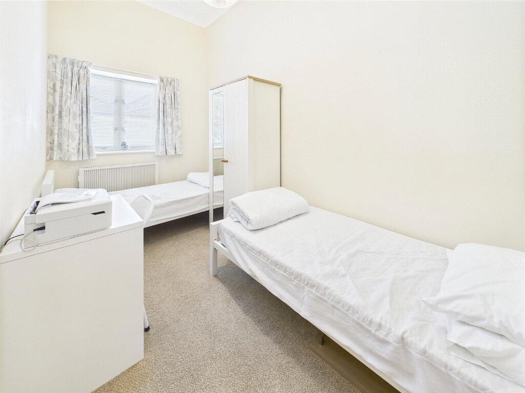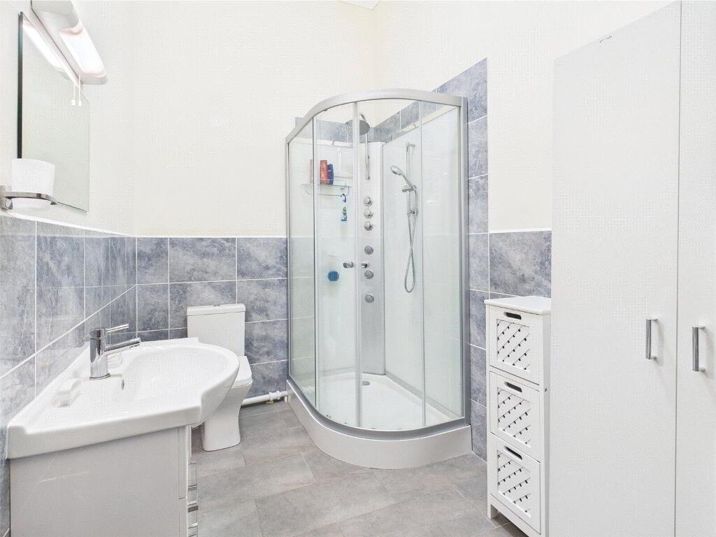 The living room is generously proportioned, with a large window allowing natural light to flood the space, making it a warm and welcoming environment. Both bedrooms are comfortable doubles, with the main bedroom offering space for storage and a large window offering natural light. The bathroom has been tastefully appointed, with a large shower, room for additional storage, basin, and cloakroom, all in a clean, contemporary finish.