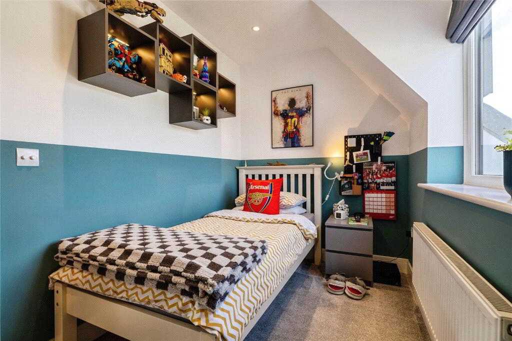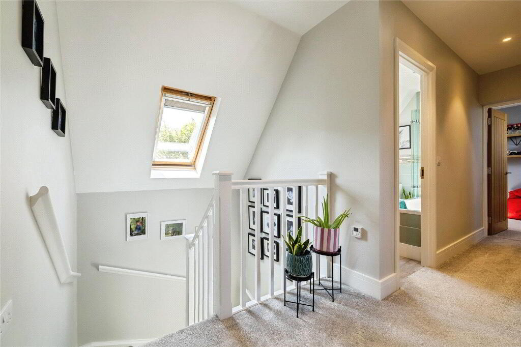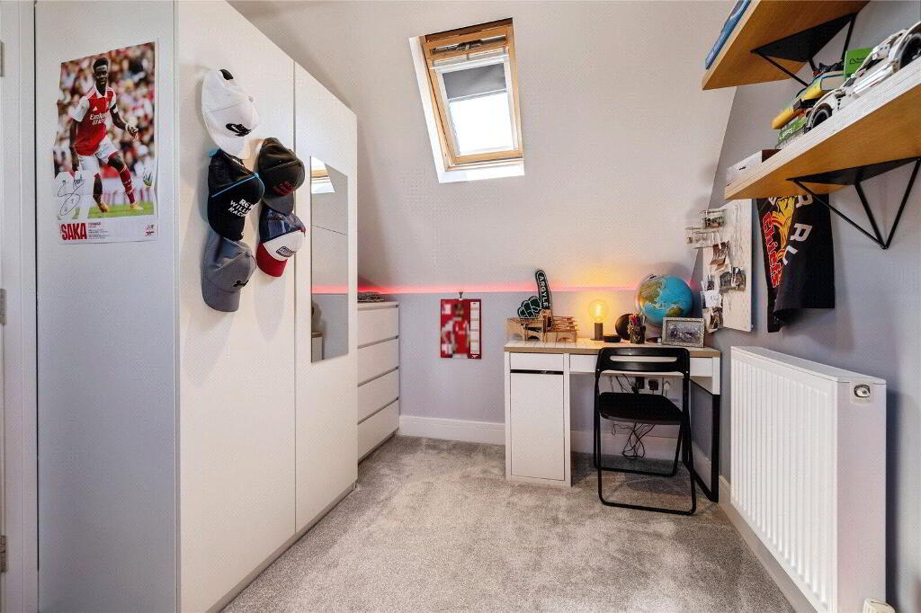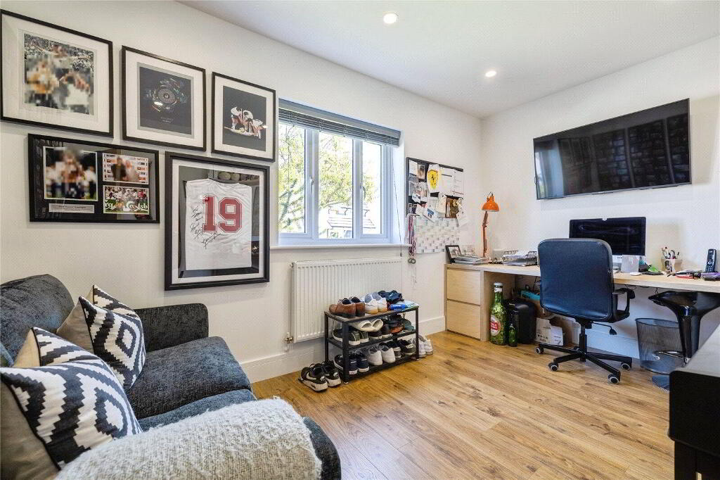 On the First Floor, the impressive dual aspect Lounge offers contemporary comfort enhanced by concealed LED ceiling lighting. Adjoining this is a versatile second Reception Room, presently used as a snug / playroom, featuring aluminium bi-fold doors with UV protective glazing and motorised blinds that open onto the attractive rear garden. At the heart of this home is the stunning Kitchen / Diner, an expansive and elegant space ideal for cooking, entertaining and relaxing. Highlights include high quality integrated appliances such as fridge, freezer, dishwasher, 2 premium AEG ovens (one with microwave function), and an induction hob with extractor hood. The room is thoughtfully equipped with USB sockets and a TV point, and also benefits from aluminium bi-fold doors with UV-protective glazing and motorised blinds offering seamless access to the garden.