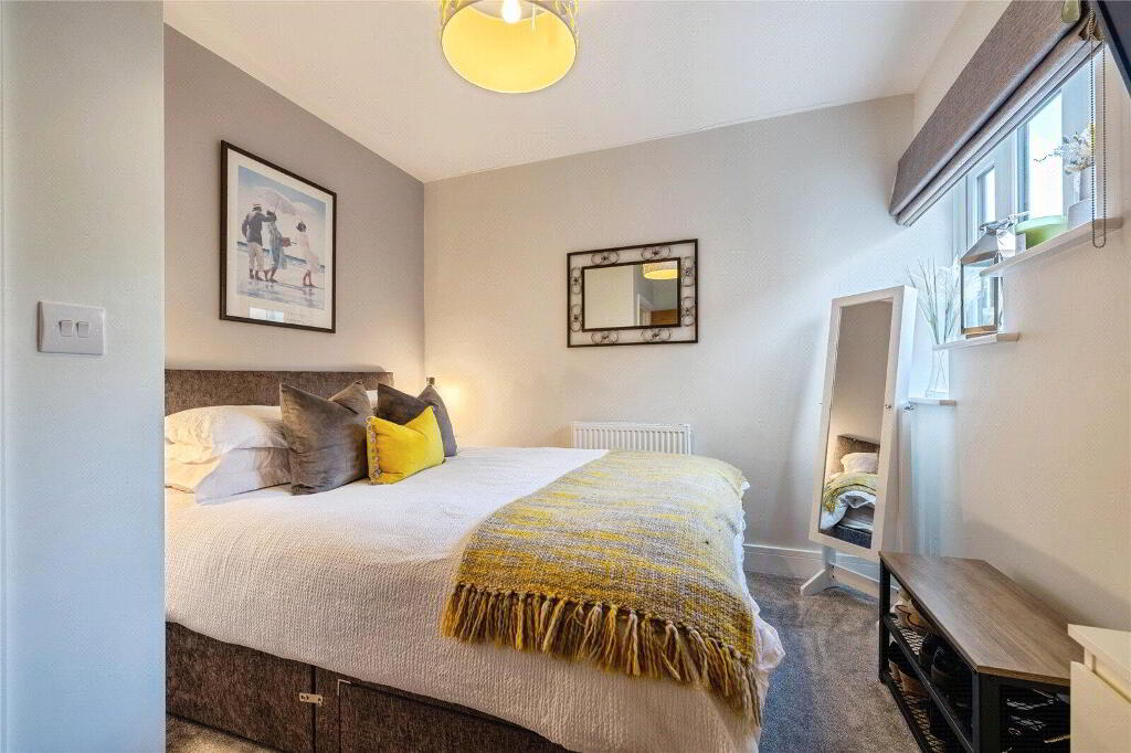 Entering through a stylish composite front door, the Ground Floor comprises 2 generous double Bedrooms - one currently utilised as a home office, complete with fitted desk and storage. This level also includes an exquisite Shower Room featuring a luxurious drench shower, handheld shower attachment, WC and wash hand basin together with a bespoke cabinet neatly housing the washing machine and tumble dryer.