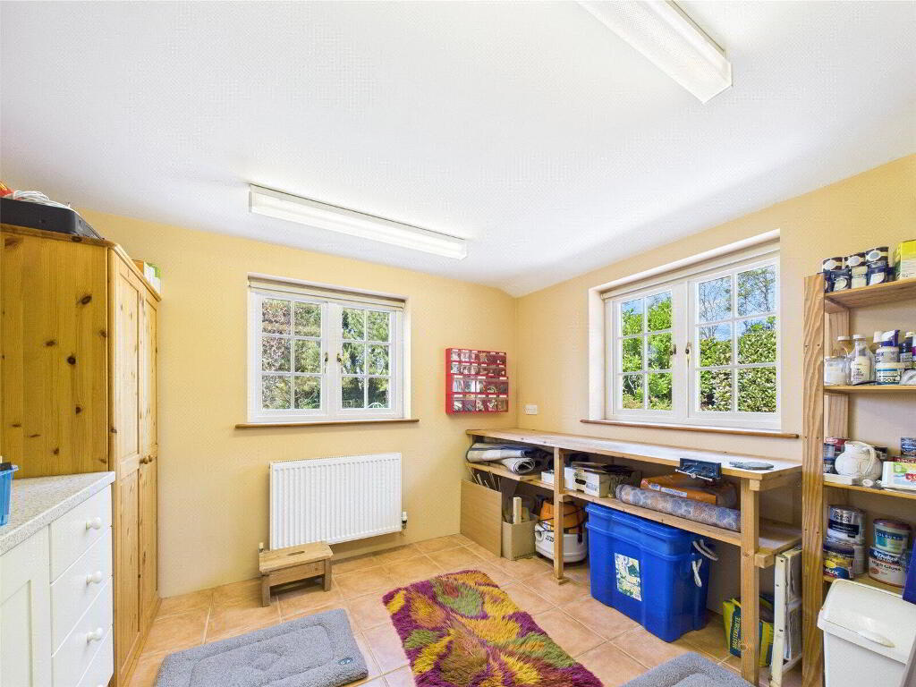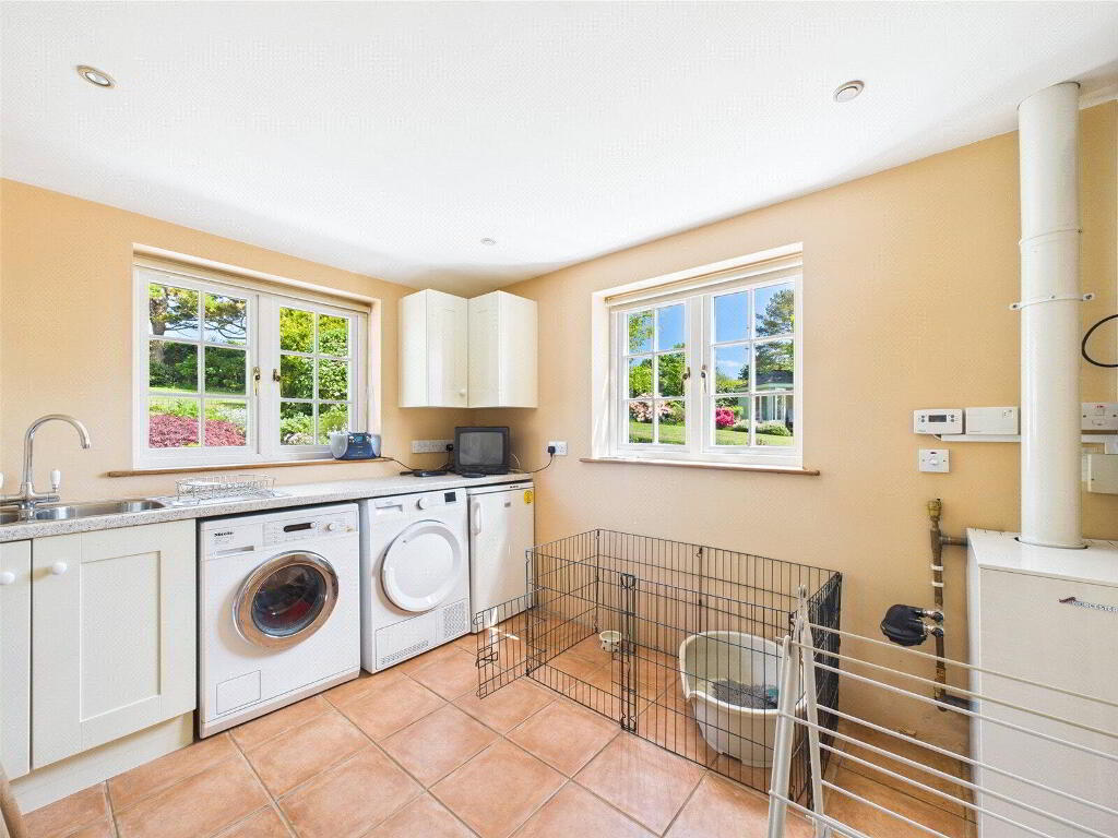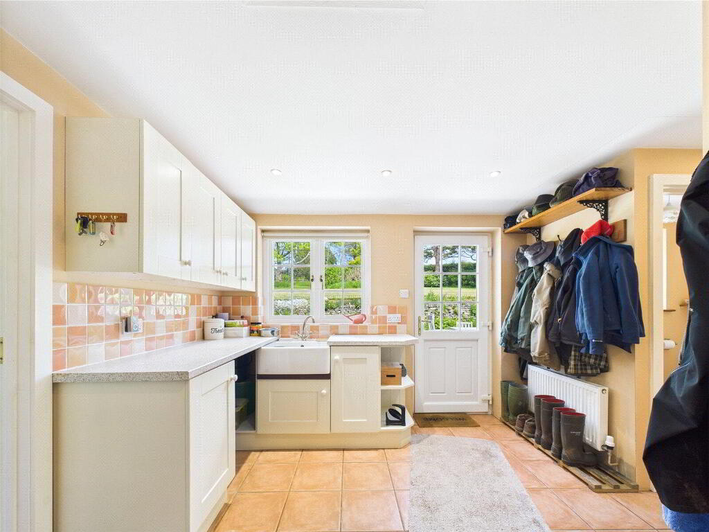 Beyond the kitchen lies a substantial extension, adding valuable living and utility space to the home. This includes a large boot room/games room, a well-appointed cloakroom, and an expansive utility room that could easily double as a hobby space or home workshop, offering great flexibility for modern family life.