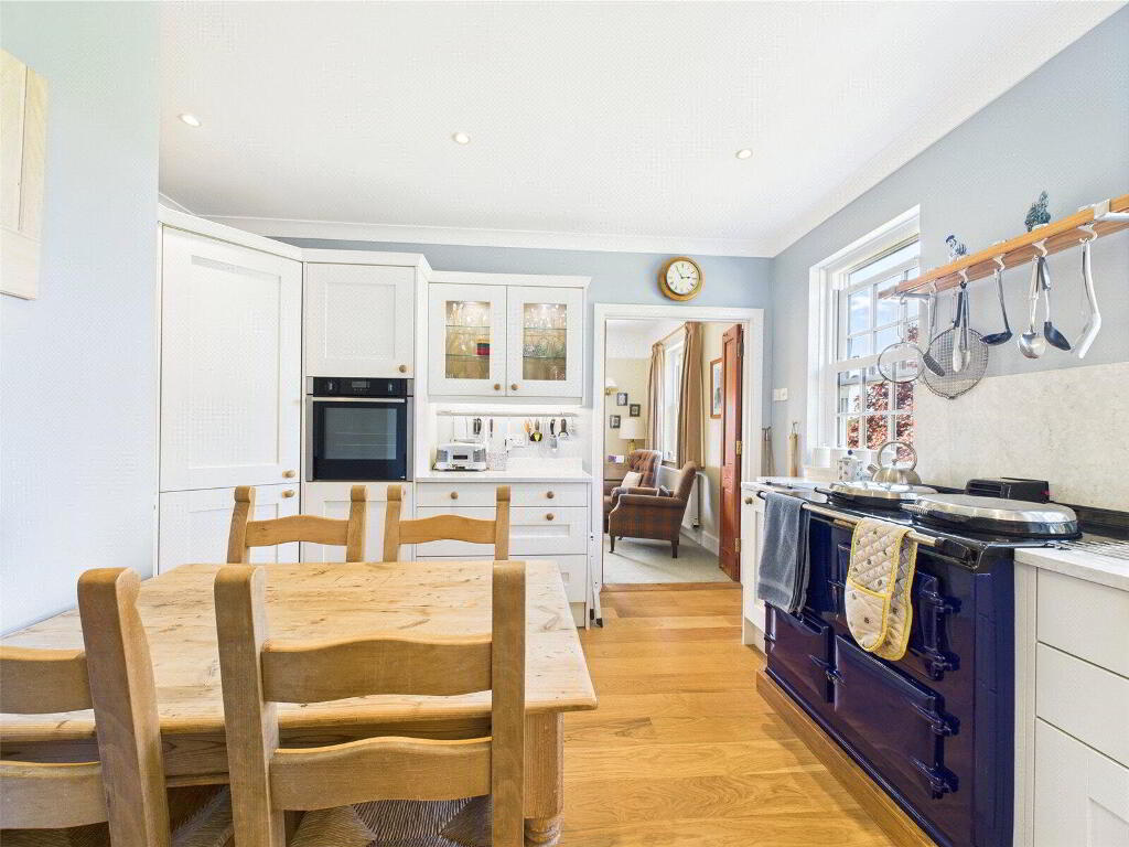 The ground floor accommodation is both spacious and thoughtfully laid out, designed to maximise natural light and the spectacular views. The elegant sitting room, complete with a characterful woodburning stove, offers a warm and inviting space for relaxation. Adjacent is the formal dining room, ideal for entertaining, which flows seamlessly into a recently refitted kitchen of exceptional quality. No expense has been spared here, with bespoke cabinetry, Corian worktops, and a classic AGA range cooker providing a luxurious and practical cooking environment.