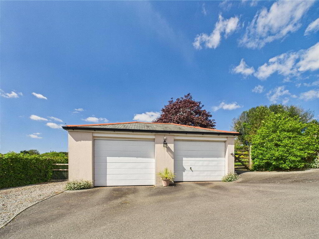 A detached double garage, complete with electric doors and a thoughtfully designed extension, provides ample space for vehicles, storage, or workshop use.