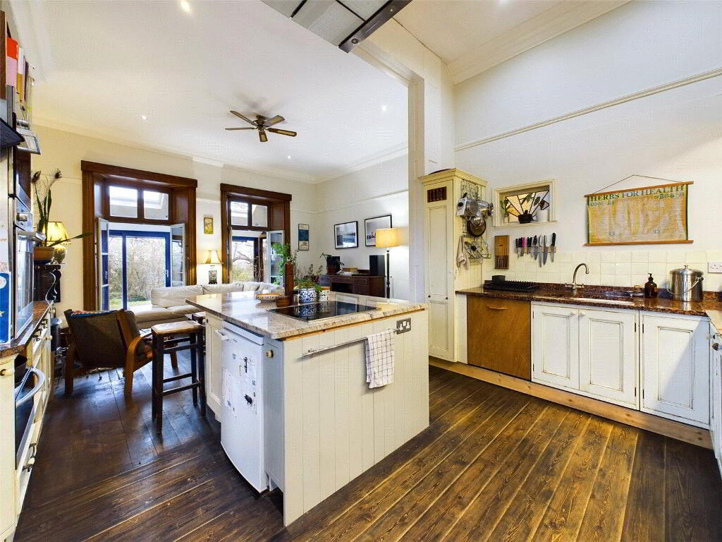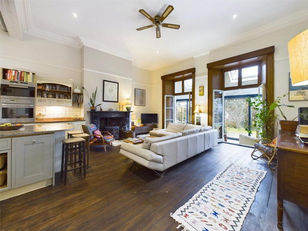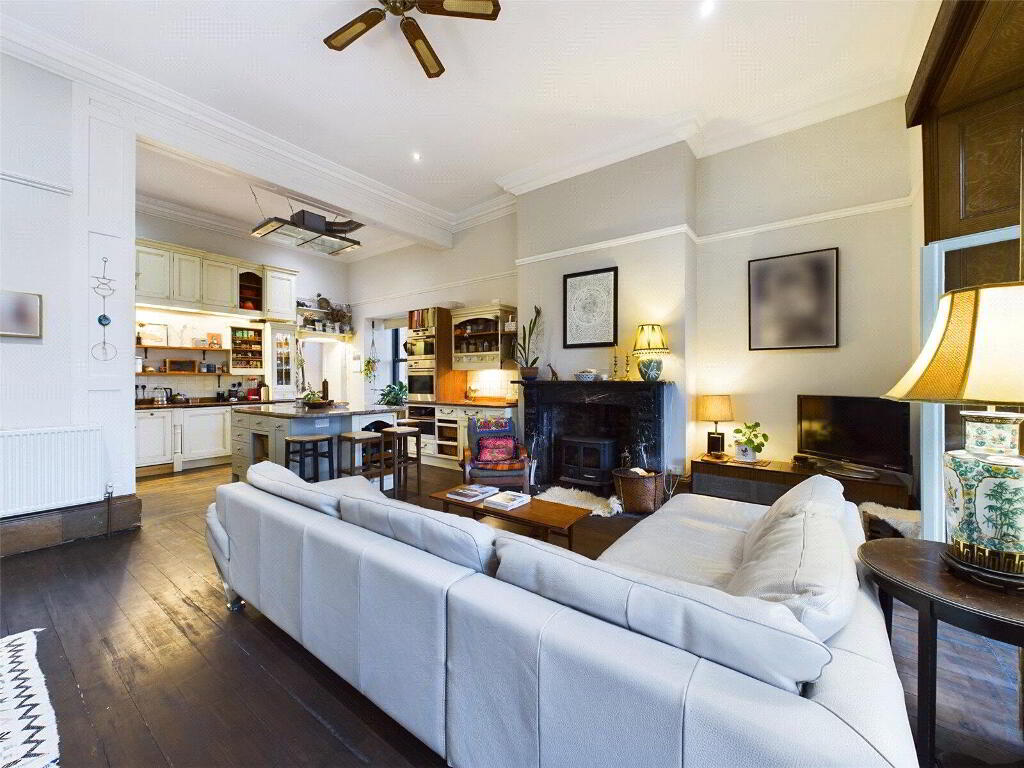 An impressive light and airy room with fitted kitchen area comprising a range of wall and base mounted units with work surfaces over incorporating 1 1/2 sink unit with water filtered mixer taps over and cut drainer grooves. Built in Miele double oven, Miele warming drawer, Miele dishwasher and under counter fridge and freezer. Central island unit with built in 4 ring Miele induction hob, suspended extractor hood over and space for under counter fridge. Ample reception space for dining table and chairs or sitting area with ornate fireplace housing log burner. Doorway leading to Utility Room and Wet Room. Window to side elevation. Twin set of double doors leading to: