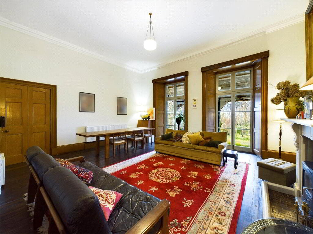 An impressive reception room with ornate fireplace housing log burner and twin double doors leading out onto the covered porch and gardens.