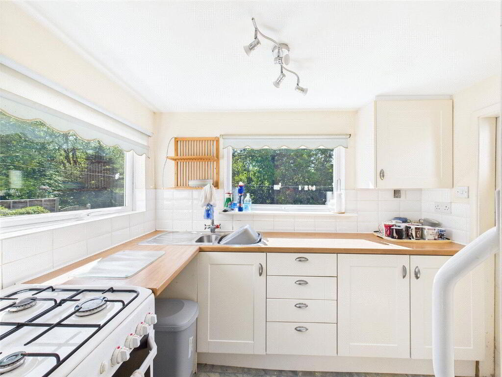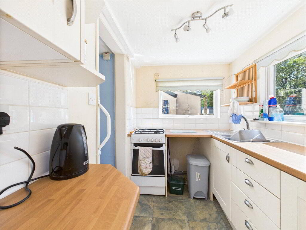 Fitted with a range of wall and base mounted units with work surfaces over, incorporating a stainless steel 1 1/2 sink drainer unit with mixer tap. Space for electric oven with gas 4 ring hob over. Plumbing for washing machine. Window to side and rear elevation, enjoying views of the rear garden and stream. Door to side, leading to the garden.