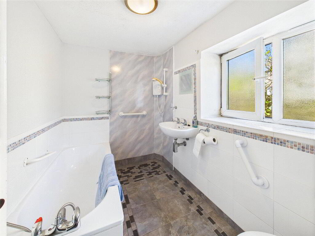 A fitted suite comprising panel bath with hand held shower attachment, walk in shower cubicle with electric shower over, corner low flush WC and wall hung wash hand basin. Frosted window to side elevation.