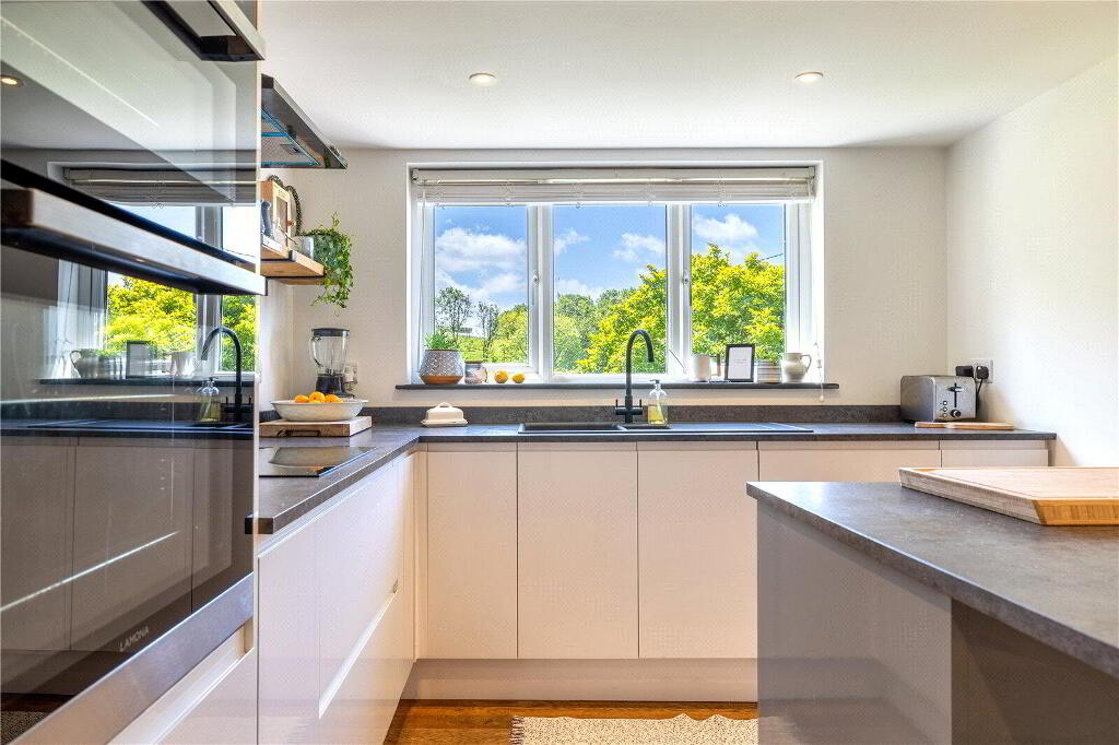 The spacious light-filled interior begins with an extended Entrance Hall featuring a utility area, cloakroom and built-in storage for coats and shoes. At the heart of the home is a beautifully designed, open-plan Kitchen / Dining / Lounge area, complete with a feature wood burner and a high-spec kitchen boasting wall and floor units, a central island, double ovens and an integrated dishwasher. Flowing seamlessly from the main living space is a bright Conservatory - perfect for enjoying far-reaching views and sunshine throughout the day. A handy, compact Office space adds versatility to the layout, ideal for home working.