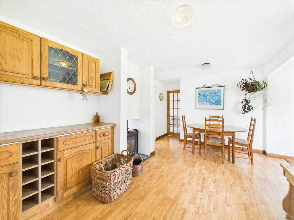 The former garage has been transformed into a stylish and contemporary kitchen, which now also serves as the property's main entrance. From here, you step into a bright and airy dining room, ideal for hosting family meals or entertaining guests. This room also provides access to the rear garden, and features a wood burner cleverly positioned between the dining area and the adjacent lounge – allowing both spaces to benefit from its warmth and character.