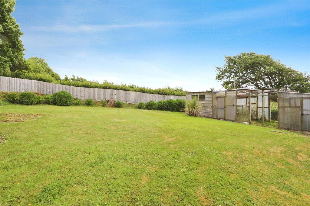 Outside, the grounds are a true highlight. A large driveway to the front of the property provides off-road parking for several vehicles leading to an adjoining Garage with power and light connected. The front garden is mainly laid to lawn and fully enclosed with timber fencing, offering excellent privacy. The rear garden is equally appealing, with a mixture of lawn and patio spaces bordered by mature hedges and colourful planting, creating a serene setting from which to enjoy the surrounding countryside. The garden also features a charming summerhouse, a greenhouse, a timber storage shed and a carport constructed from timber and corrugated iron - perfect for storage or hobby use. Distant views over green fields towards the town only enhance the sense of space and seclusion.