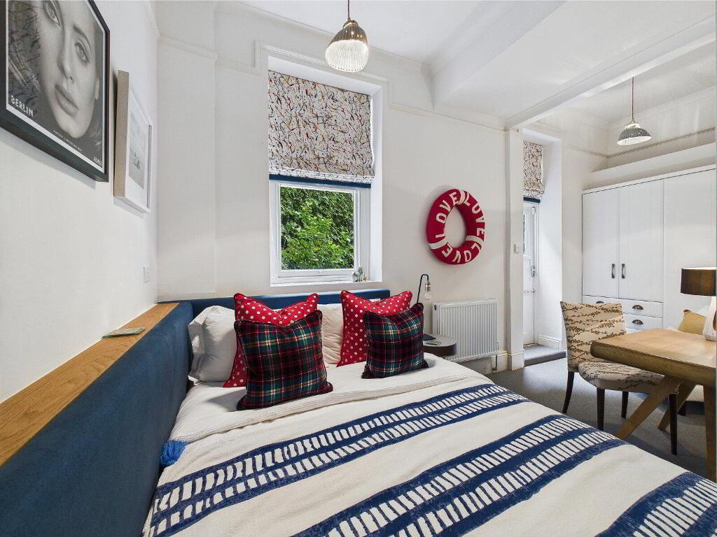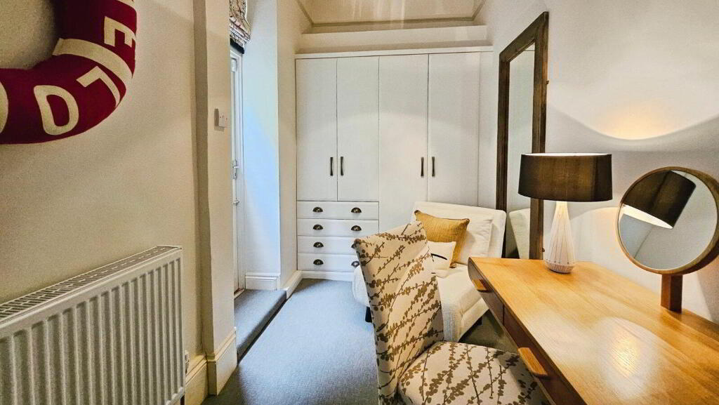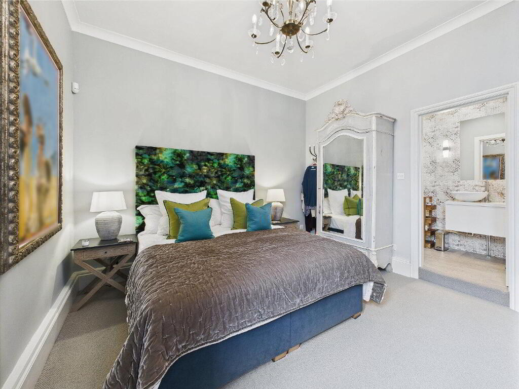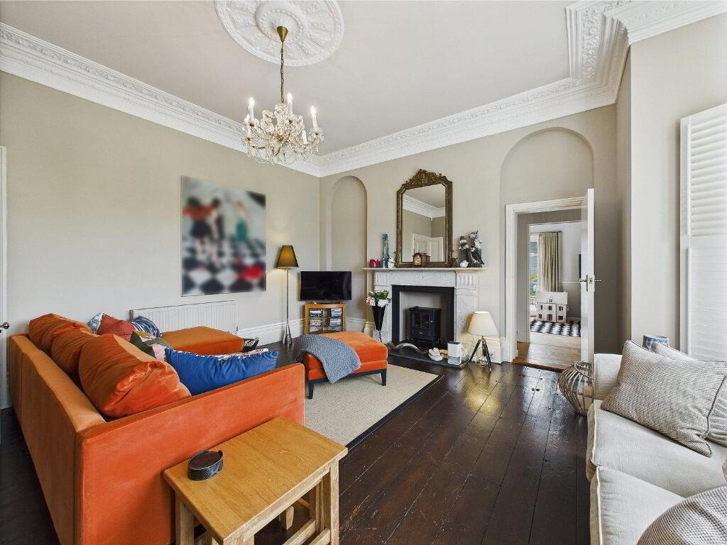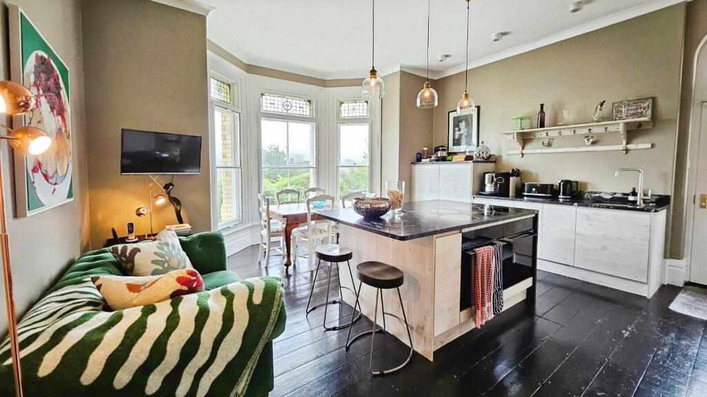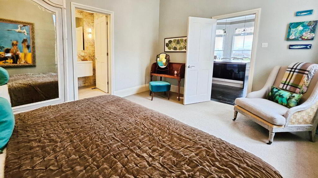 This exceptional apartment is the largest within the building and has been thoughtfully renovated to the highest standard. With its own private entrance, the home opens into a grand hallway featuring original mosaic Victorian floor tiles. The lounge is a magnificent space with a bay window, marble fireplace and views across the town towards the Cairn and Bristol Channel.