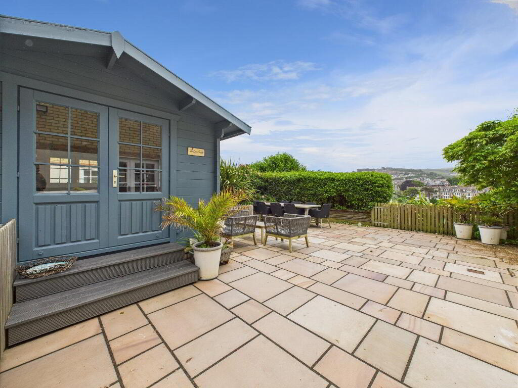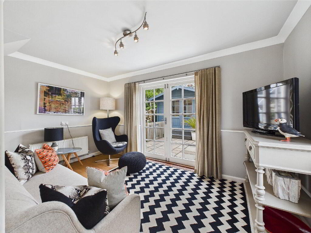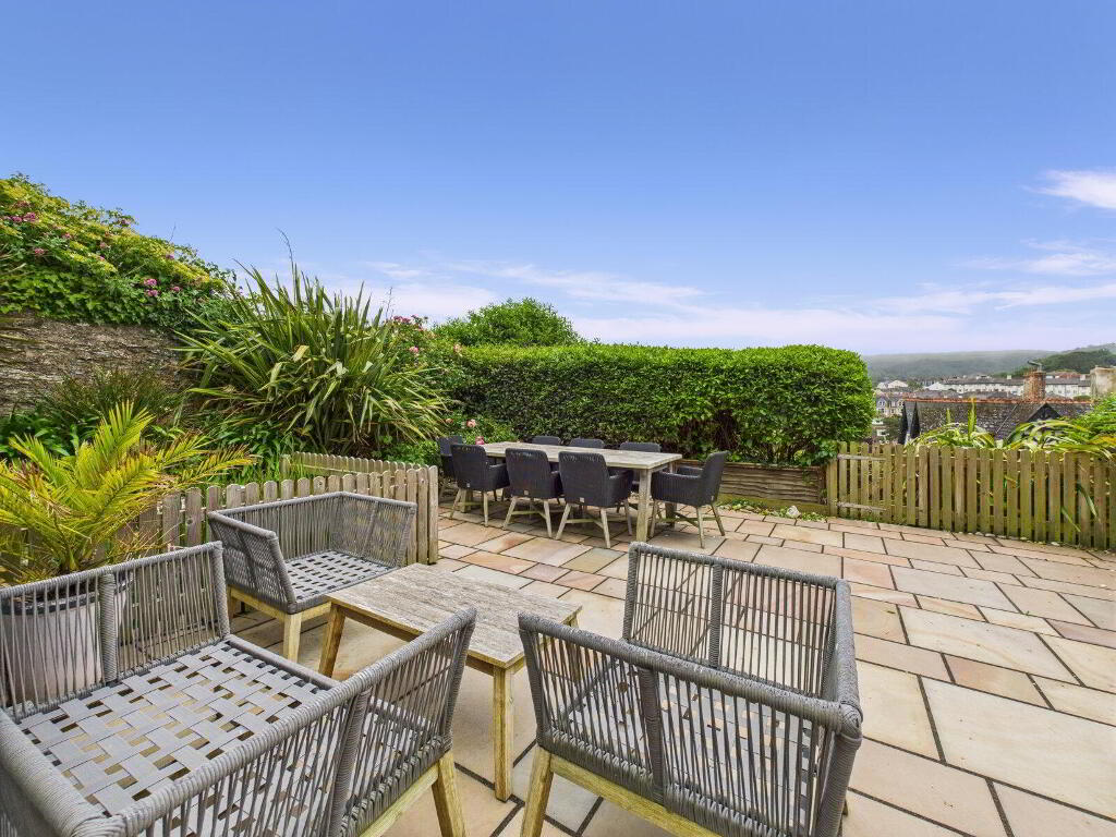 A second sitting room opens directly onto the private garden and can easily serve as a study or fourth bedroom. The stunning kitchen and dining space, complete with a high-spec island, leads to a private courtyard and useful utility area. Four generously sized bedrooms include a luxurious principal suite, two with en-suite facilities and one enjoying elevated views across the channel to the Welsh coast.