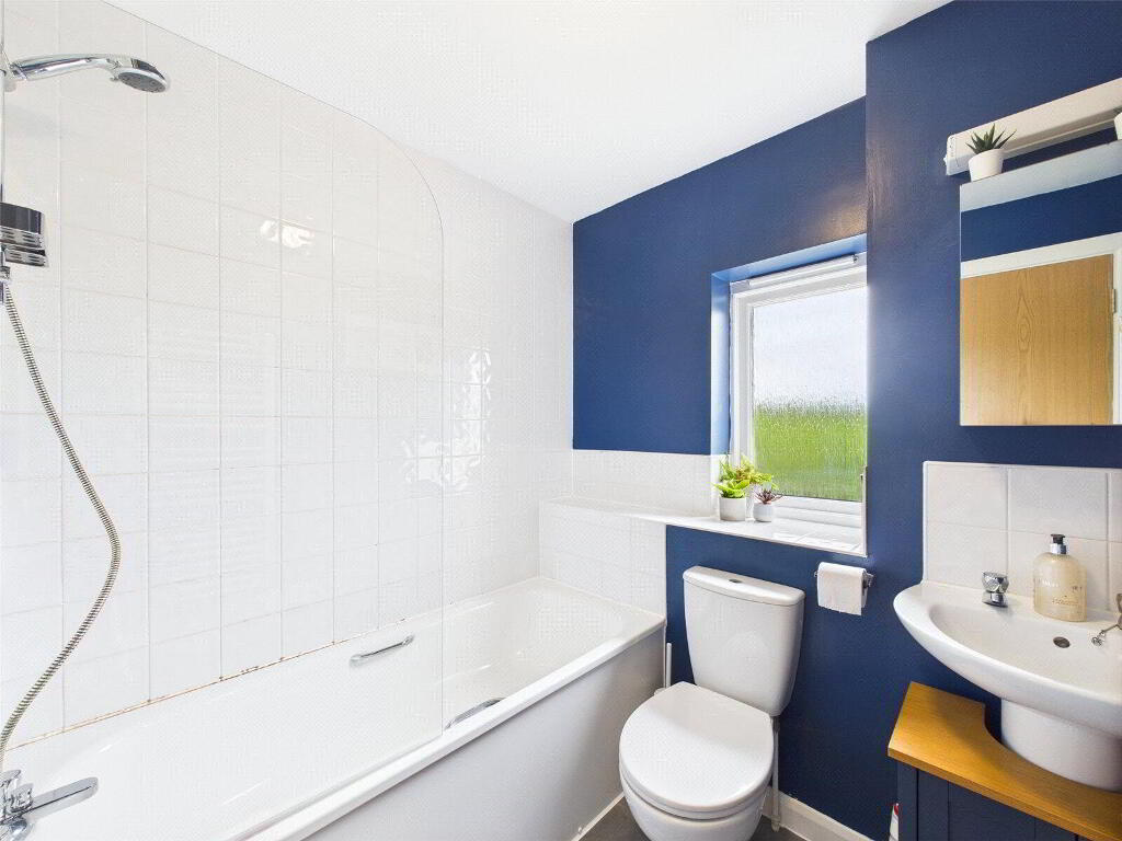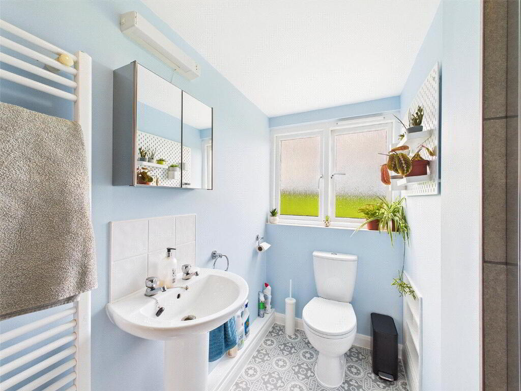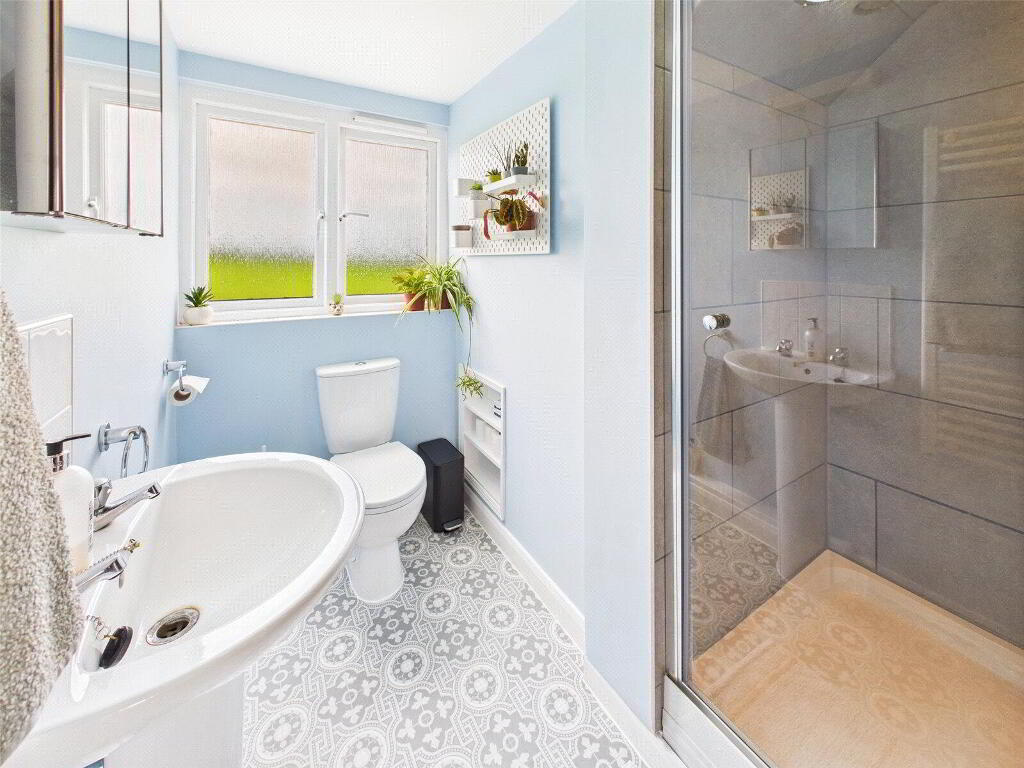 A 3 piece suite comprising shower cubicle, pedestal wash hand basin, low flush WC and heated towel rail. Frosted window to rear elevation.