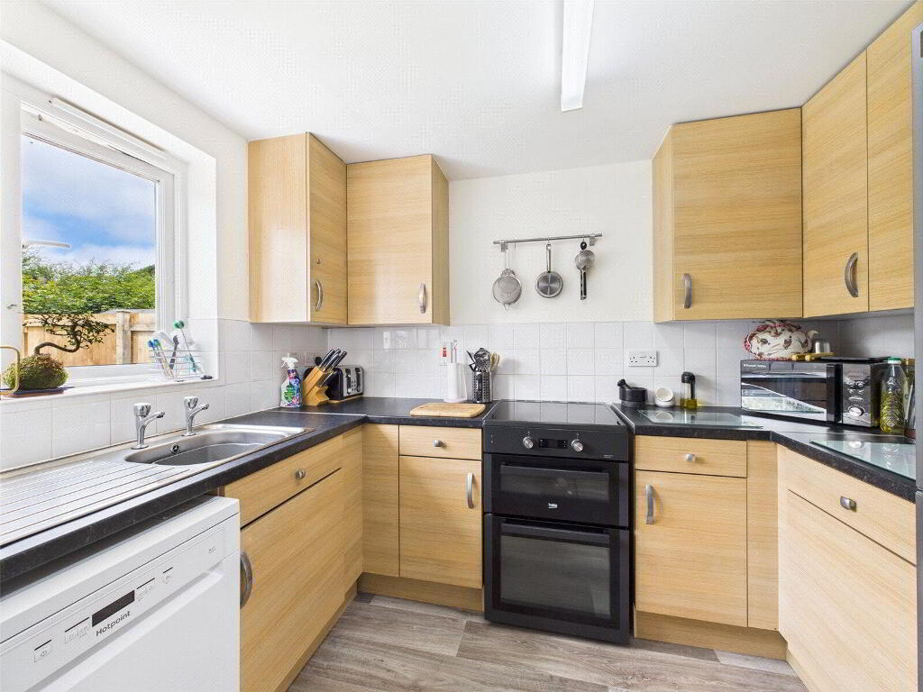 A fitted kitchen comprising a range of wall and base mounted unit with work surfaces over, incorporating a stainless steel sink drainer unit with mixer tap. Space for electric oven and free standing fridge/freezer, plumbing for dishwasher. Access to storage cupboard housing the hot water cylinder. Window to rear elevation, enjoying views of the garden.