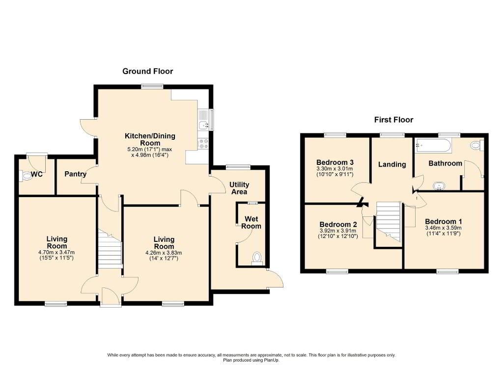Inside, the property offers spacious, versatile living with two sizeable reception rooms, a large kitchen/diner, utility room, walk-in pantry, ground-floor WC, and a wet room. All rooms are well proportioned, flooded with natural light, and perfectly suited to family life or entertaining. Upstairs, three comfortable bedrooms offer peaceful retreats, ideal for a growing family or anyone seeking space and flexibility.