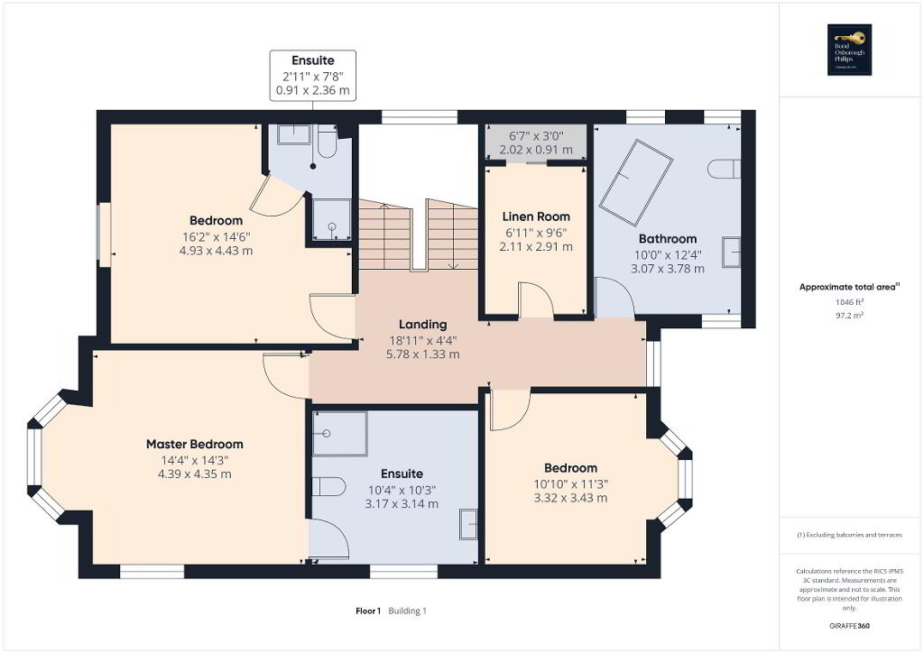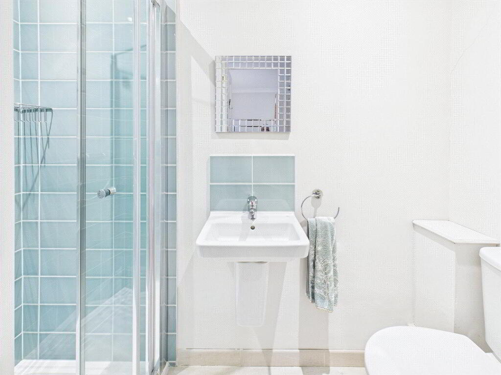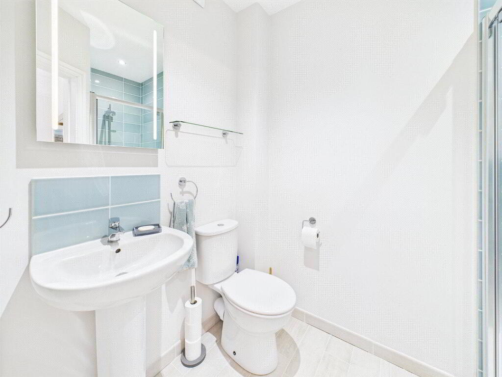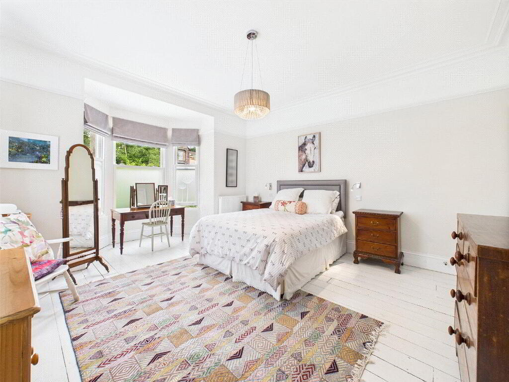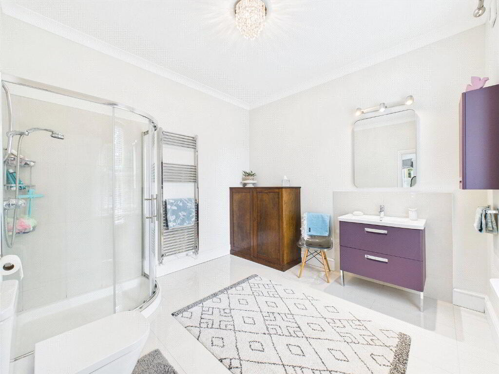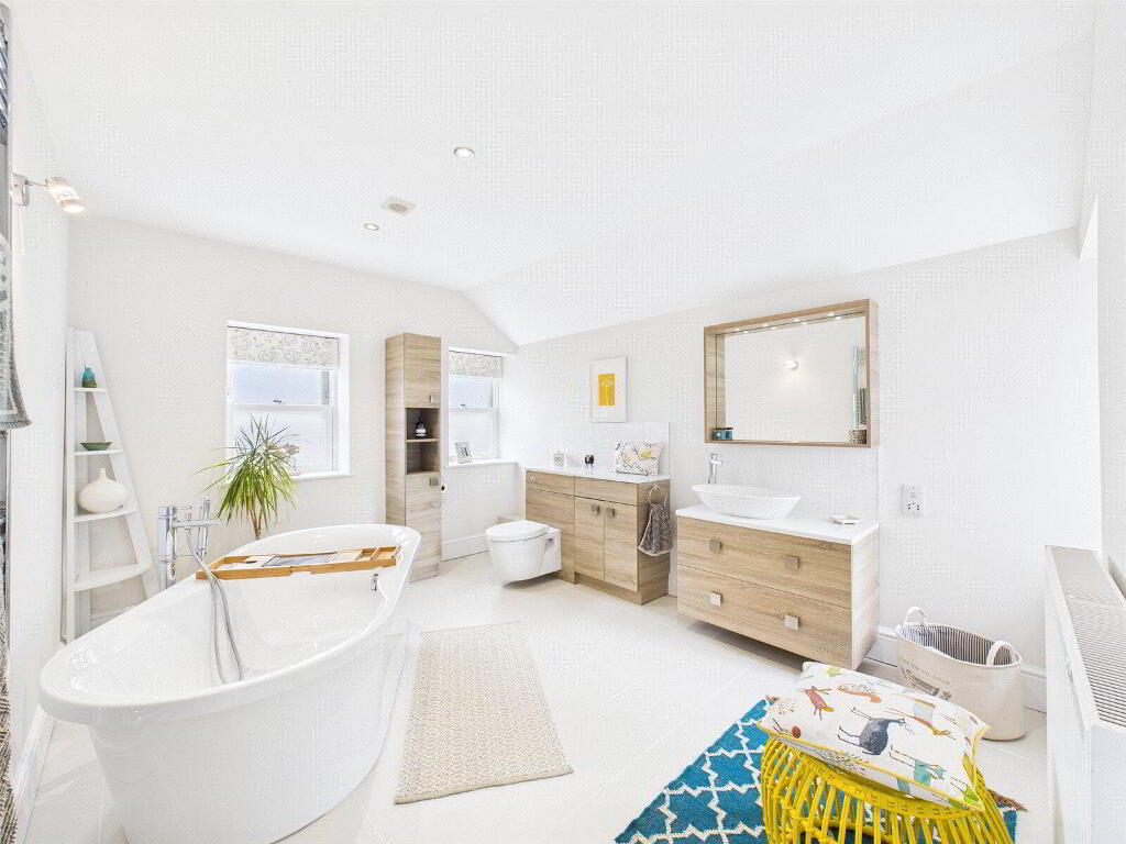 On the first floor, the principal bedroom enjoys a dual aspect and features a generous en-suite with quadrant shower, vanity basin, WC, and heated towel rail. The second bedroom, also a double, benefits from its own compact en-suite shower room—perfect for guests. A third double bedroom overlooks the garden and is served by the luxurious family bathroom, complete with a freestanding roll-top bath, stylish vanity units, and elegant fittings. A dedicated linen room provides excellent built-in storage and hanging space.