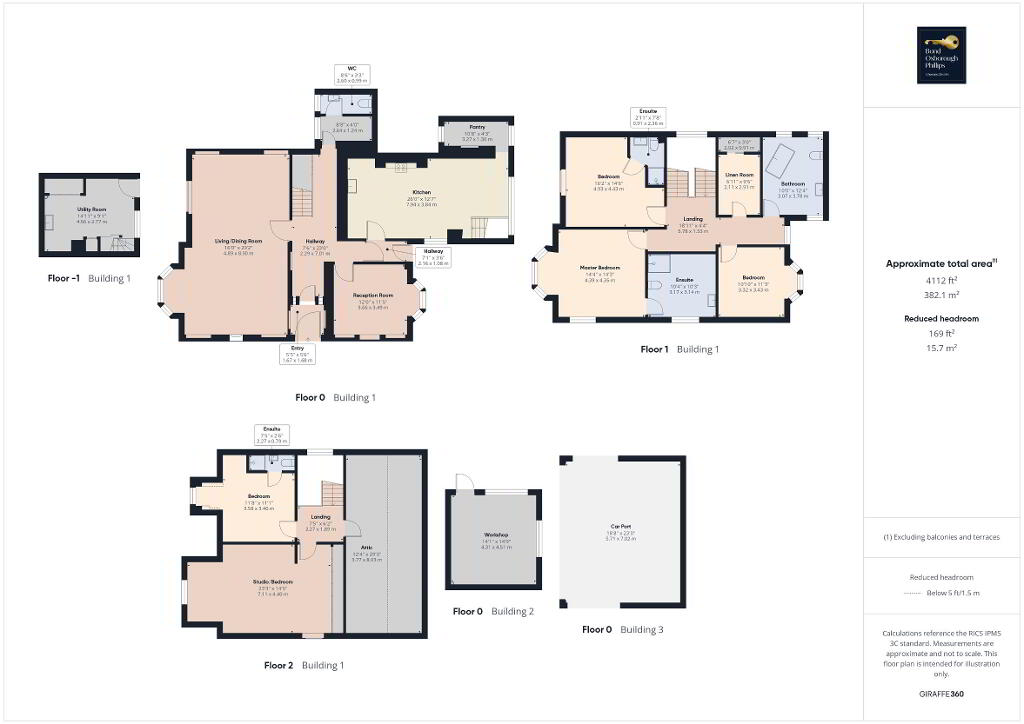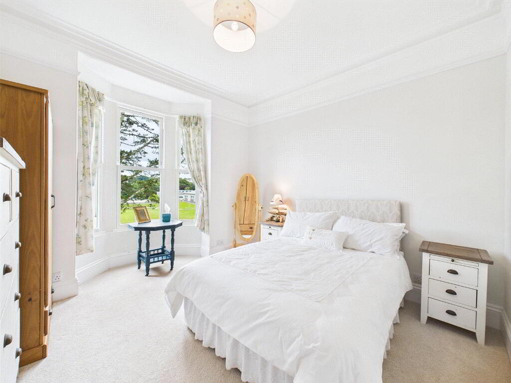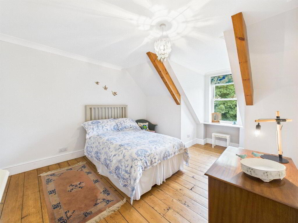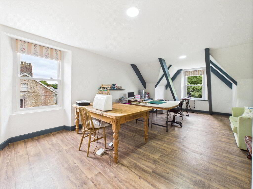 The second floor presents two further bedrooms. Bedroom four includes its own en-suite shower room, while bedroom five—a dual-aspect room currently used as a hobby and sewing room—could serve a variety of purposes, including as a playroom or study. A spacious walk-in storage area is also located on this level.