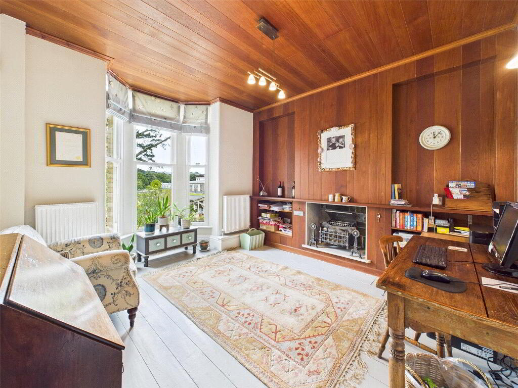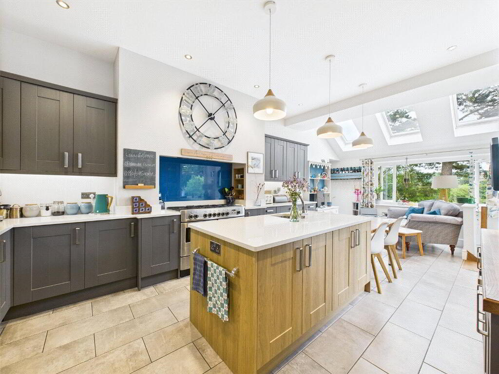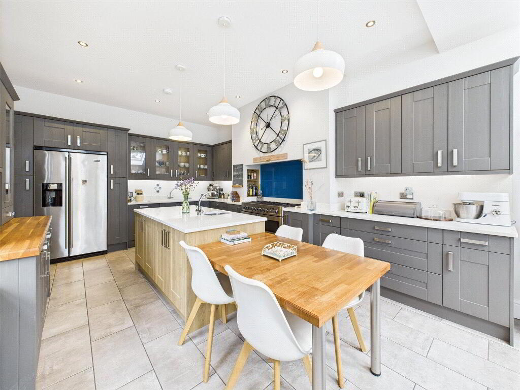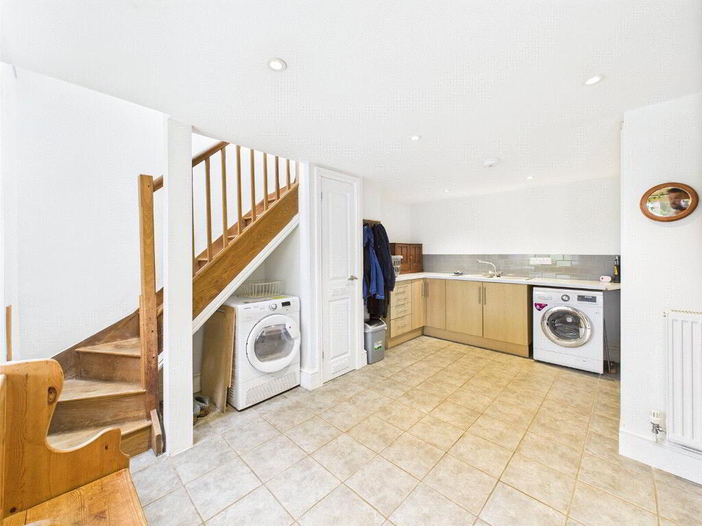 At the rear of the house is the heart of the home—an impressive kitchen/breakfast room that has been stylishly refitted to suit modern family life. Featuring a large central island, Silestone Quartz worktops, integrated dishwasher, and space for a range cooker, this space is as practical as it is beautiful. At one end, a cosy snug area invites quiet moments with views over the garden, and underfloor heating ensures comfort throughout. A walk-in pantry/utility sits just off the kitchen, with stairs leading down to the main utility room on the lower ground floor. This practical space offers fitted units, a sink, appliance space, and direct access to the rear garden, as well as housing the gas boiler and hot water cylinder.