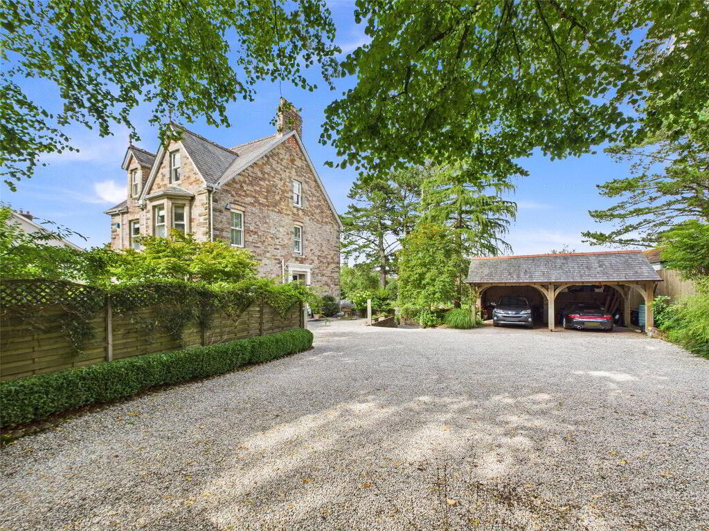 Outside, the home continues to impress. From the roadside, a stone-pillared entrance leads to a generous stone-chipped driveway, offering ample parking and turning space. A substantial open-fronted double car port provides covered parking for two vehicles. The front garden is attractively landscaped with well-kept borders and centred around a beautiful spring-flowering magnolia tree.