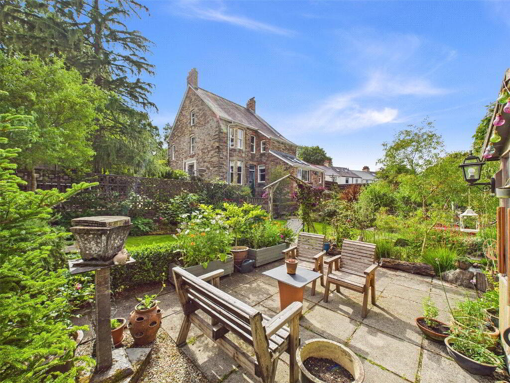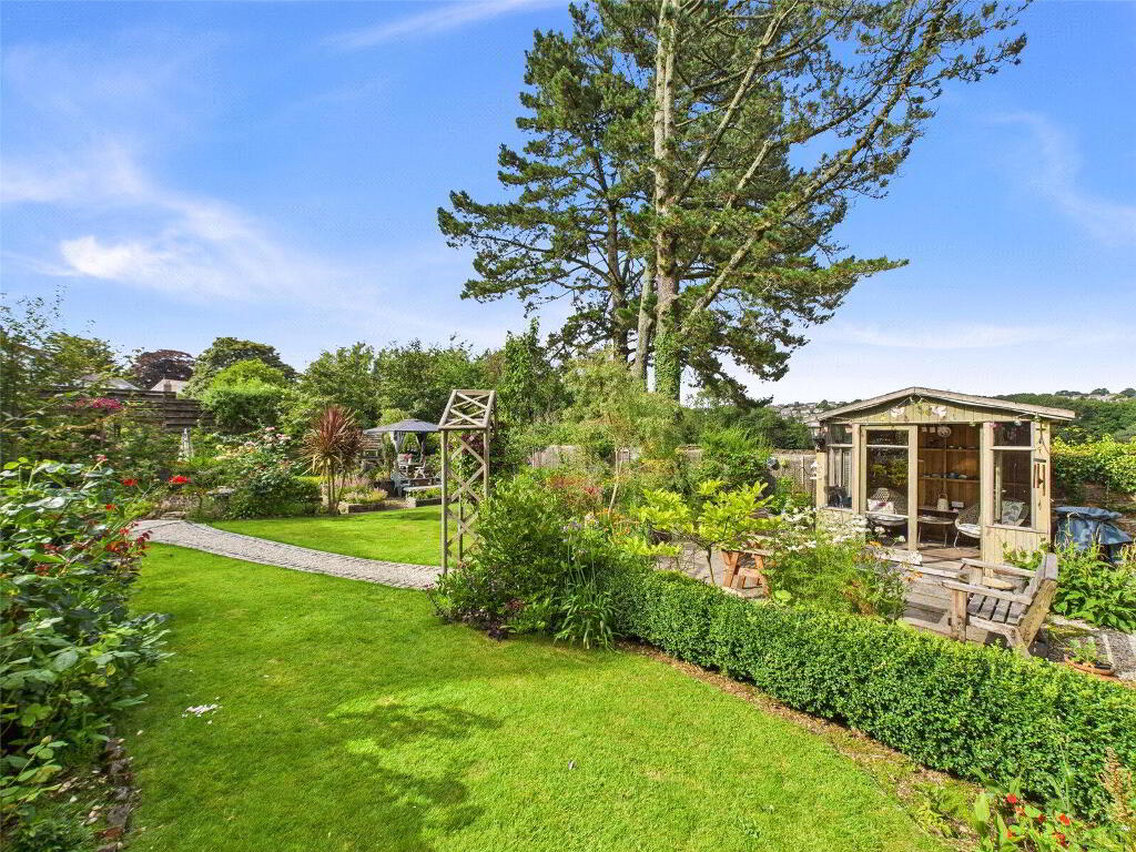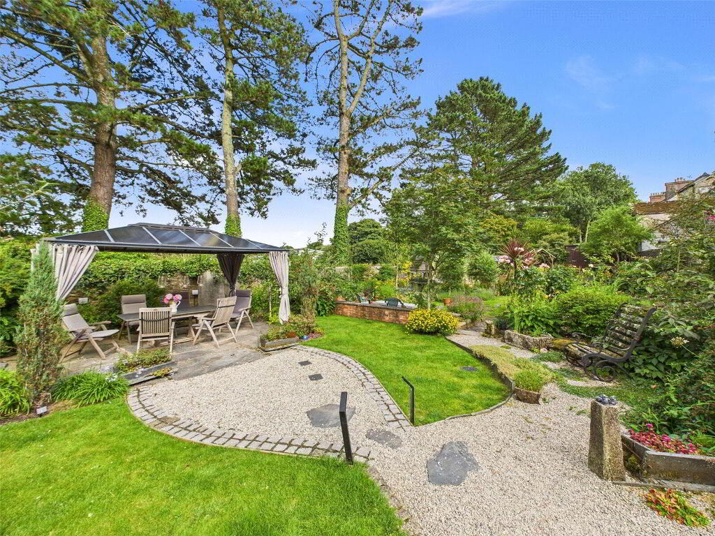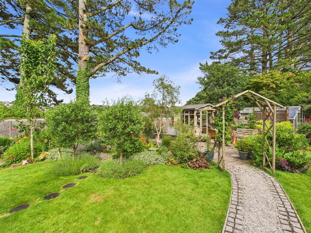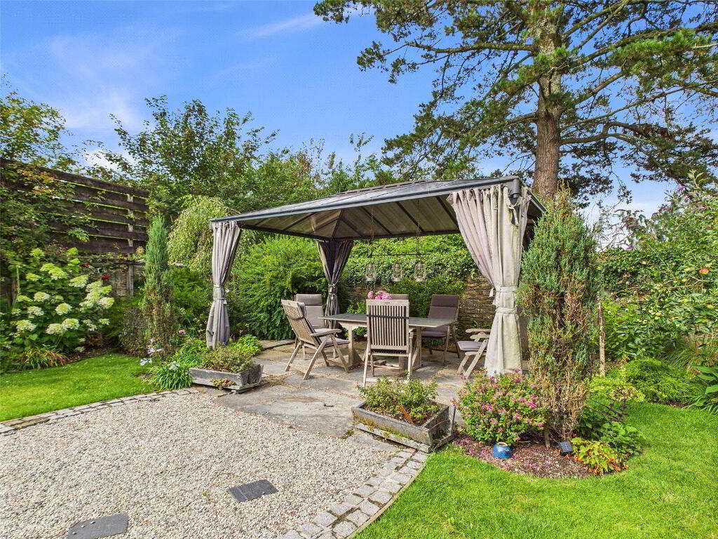 To the rear, the private landscaped garden is a true retreat. With lawns, stone walkways, seating areas, and an ornamental pond, it offers both tranquillity and space for entertaining. A charming summerhouse, timber storage sheds, and a superb 14ft x 14ft workshop with light and power provide further value and versatility. To one side of the house, a gated storage area is ideal for keeping logs, bins, or tools neatly out of sight.