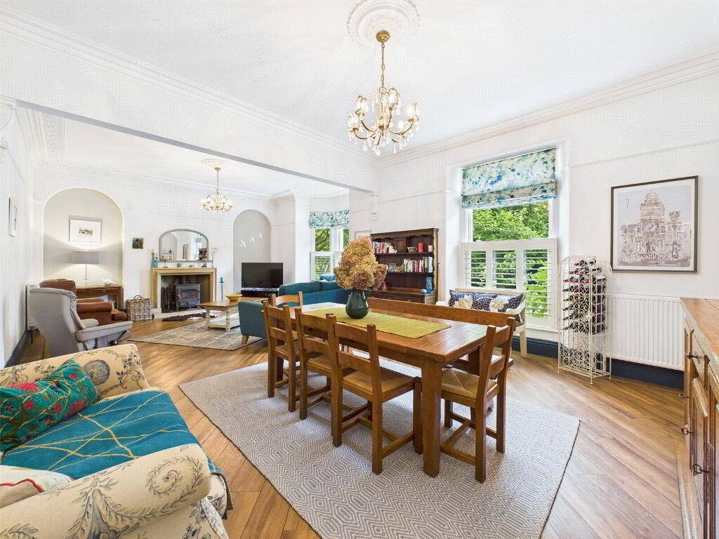 To the left, a 30ft open-plan living and dining room offers elegant, flexible space for both entertaining and everyday living. Rich with original features including ornate ceiling cornices, ceiling roses, and traditional window shutters, the room is further enhanced by Karndean flooring and a wood-burning stove set within a beautiful fireplace.